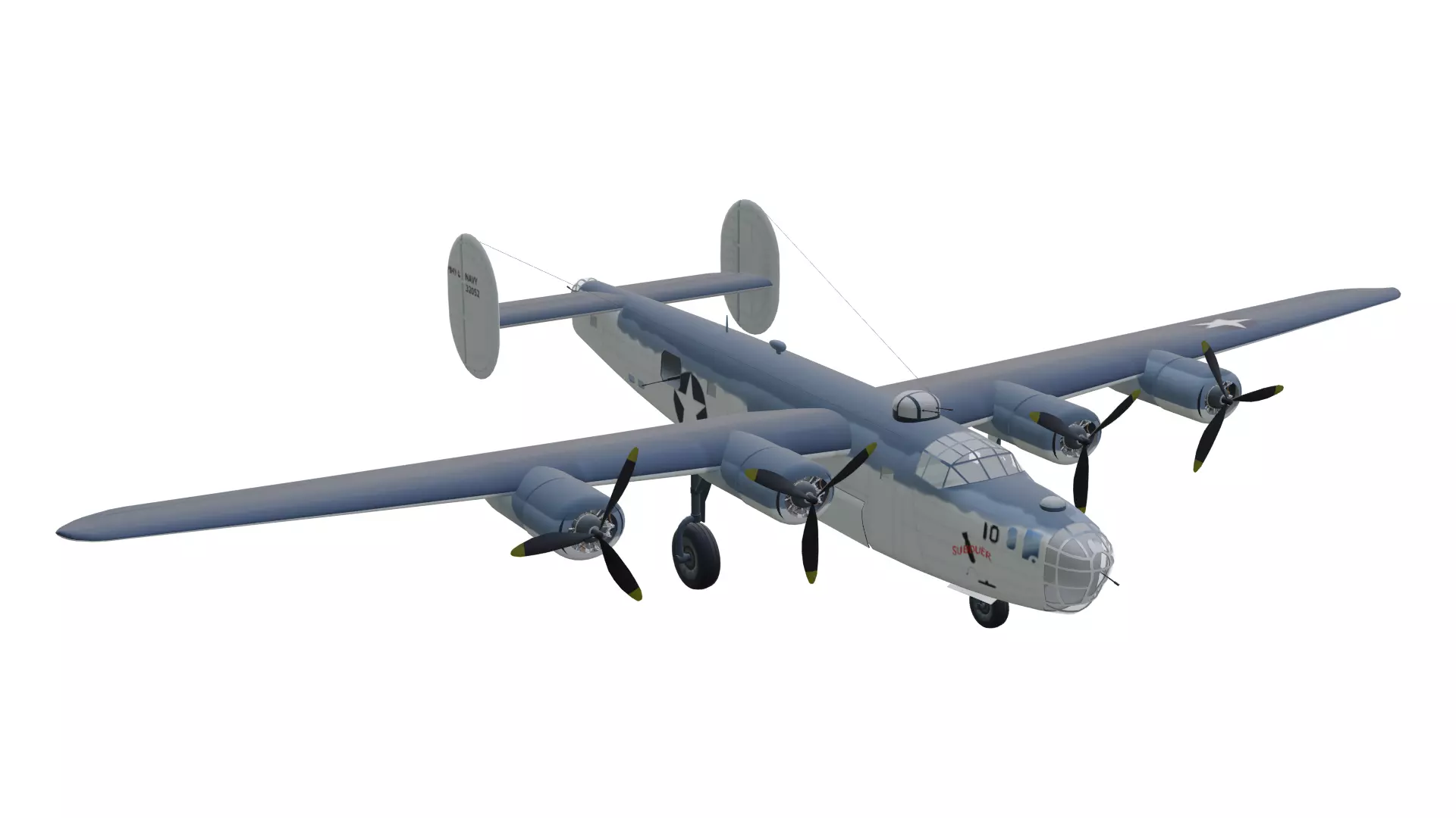 The Consolidated B-24 Liberator is a high quality, photo real model that will enhance detail and realism to any of your rendering projects. This model captures the heavy, slab-sided design of the most-produced American military aircraft in history. It features its signature shoulder-mounted Davis wing, twin tail fins, four powerful radial engines, and authentic World War II United States Navy livery.The model has a fully textured, detailed design that allows for close-up renders. Renders have no postprocessing.