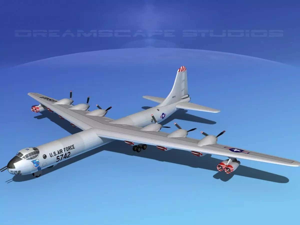 Version B-36A (used for training) and B-36B come with propellers only, the B-36D through final production included 4 jet engines mounted below the wings in pods of two engines each outside of the propeller engines. This model includes a lot of detail and paint schemes from actual squadrons. There are many animateable features including 4 turbines, flaps, ailerons, rudder, elevators, landing gear retract and landing gear doors. Propellers are animated. The models are fully textured.