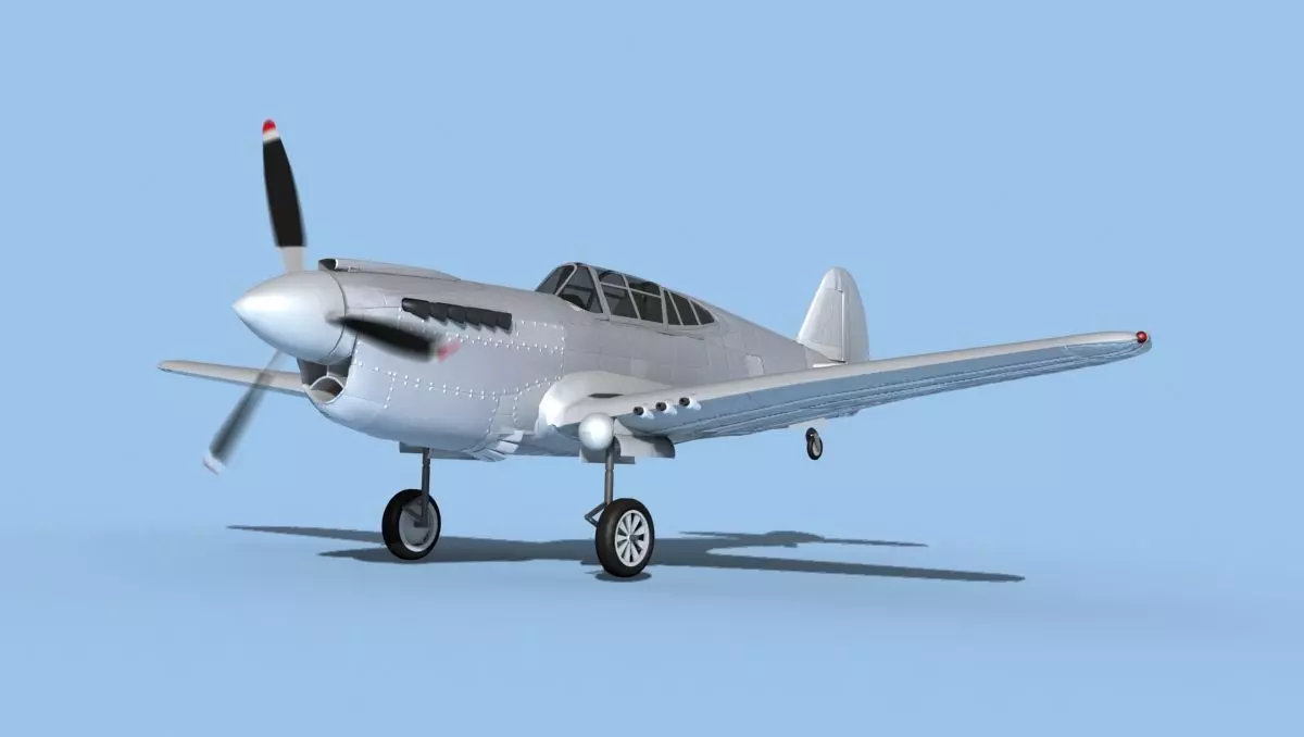 Curtiss P-40F is built near to scale and includes a lot of detail. The cockpit is well populated with seat, bullet proof shield, instruments, and controls as well as the exterior are complete with animateable flight controls. It also has an animated propeller, animateable landing gear and the canopy can slide open. The landing gear doors may be opened and closed. It is fully textured, and liveries are based on actual service liveries. There are 44 materials and textures used in this model. Many are as small as 200 x 200 pixels while others like wings are quite large at 2137x551 pixels. Textures are jpeg format in almost all cases. A Mtl file is included in the obj download.