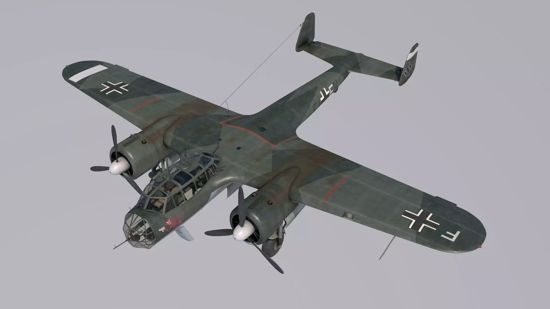 The Dornier Do 17, sometimes referred to as the Fliegender Bleistift (flying pencil), is a light bomber of Nazi Germany during World War II. It was produced by Claudius Dornier's company, Dornier Flugzeugwerke. The aircraft was designed as a Schnellbomber (fast bomber), a light bomber which, in theory, would be so fast that it could outrun defending fighter aircraft. The Dornier was designed with two engines mounted on a shoulder wing structure and possessed a twin tail fin configuration. The type was popular among its crews due to its handling, especially at low altitude, which made the Do 17 harder to hit than other German bombers. Designed in the early 1930s, it was one of the three main Luftwaffe bomber types used in the first three years of the war. The Do 17 made its combat debut in 1937 during the Spanish Civil War, operating in the Condor Legion in various roles. Along with the Heinkel He 111 it was the main bomber type of the German air arm in 1939–1940. The Dornier was used throughout the early war, and saw action in significant numbers in every major campaign theatre as a front line aircraft until the end of 1941, when its effectiveness and usage was curtailed as its bomb load and range were limited. High poly, high detailed 3D model with separate control surfaces, full interior, bomb load and landing gear.