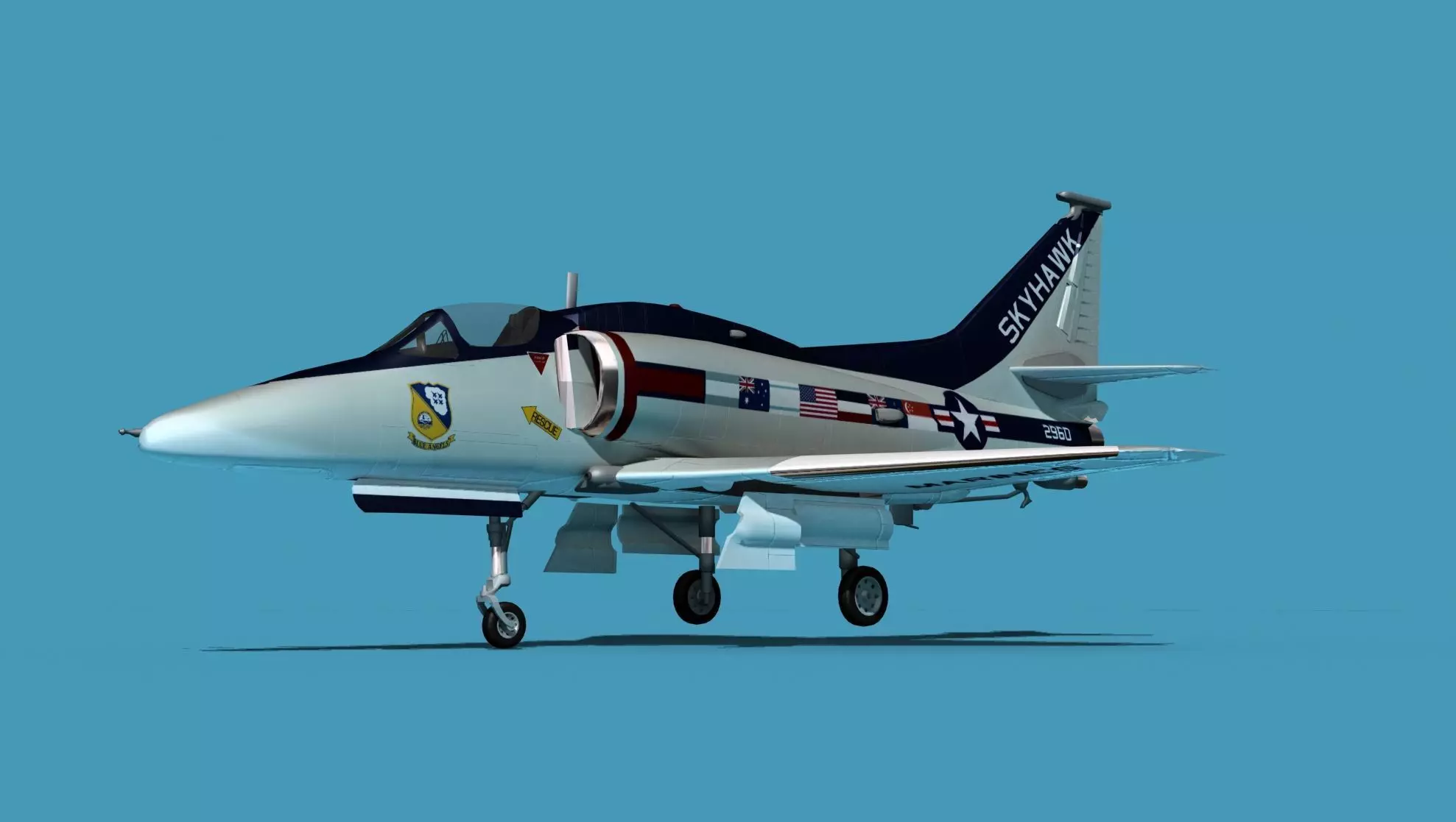 The Douglas A-4M Skyhawk was the last of a line of small carrier borne jet fighters developed by Douglas Aircraft beginning with the A-4A Skyhawk in 1954. These aircraft were designed as ground attack aircraft and saw combat in Vietnam, 6 day war, Persian Gulf War, and other conflicts. These were the smallest aircraft designed to carry a nuclear bomb. They were in service until 2003 with the US Navy and in the 2010s with other countries.The model was built near to scale in real units and built based on drawings, photos, and other documents. This model has a moderately detailed cockpit and the following animateable features; ailerons, flaps, elevators, rudder, landing gear, canopy and landing gear doors. These models render very well and look very realistic using good animation, lighting and rendering technique. It can be used in an animated or static position within a scene, animation or animated video, or possibly programming for a flight simulation application. This model was not designed for 3d printing, these are to be used as digital files only. If you purchase one for digital printing we do not guarantee that your print will be successful.Exporting of models is limited but good for several software applications. This model is fully textured with all materials UVW mapped and applied. Most materials are planar mapped and major materials include texturing. All textures and materials are included as shown. Objects are logically named for ease of scene management.No cleaning up necessary, just drop your models into the scene and start rendering.No special plug-ins are needed to open scene.In most cases the liveries are based on actual service liveries or paint schemes. Many of the units, airlines or countries who flew the plane are represented here. Dreamscape Studios is a US 3d modeling firm specializing in building high definition, accurate, and detailed 3D models of commercial, civilian, and military airplanes, ships, buildings and other subjects.Dreamscape 3d models are built in ultra-low to ultra-high polygon count, (most often) near to scale and include a good amount of detail based on the resolution target. If you have a question, error or problem with the model, let us know and we will do our best to provide or get a solution for you. Be advised our models are not designed for 3d printing unless they are advertised for that purpose.