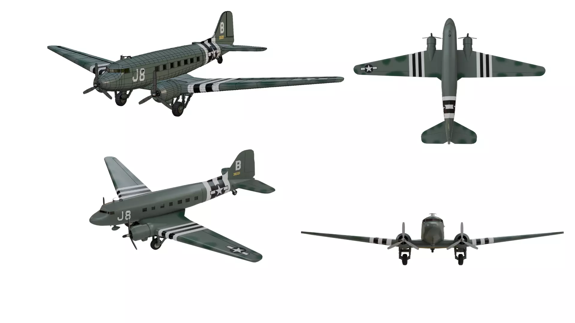 This is a realistic and accurate 3D model of the Douglas C-47 Skytrain, the iconic World War II military transport aircraft used extensively by Allied forces.