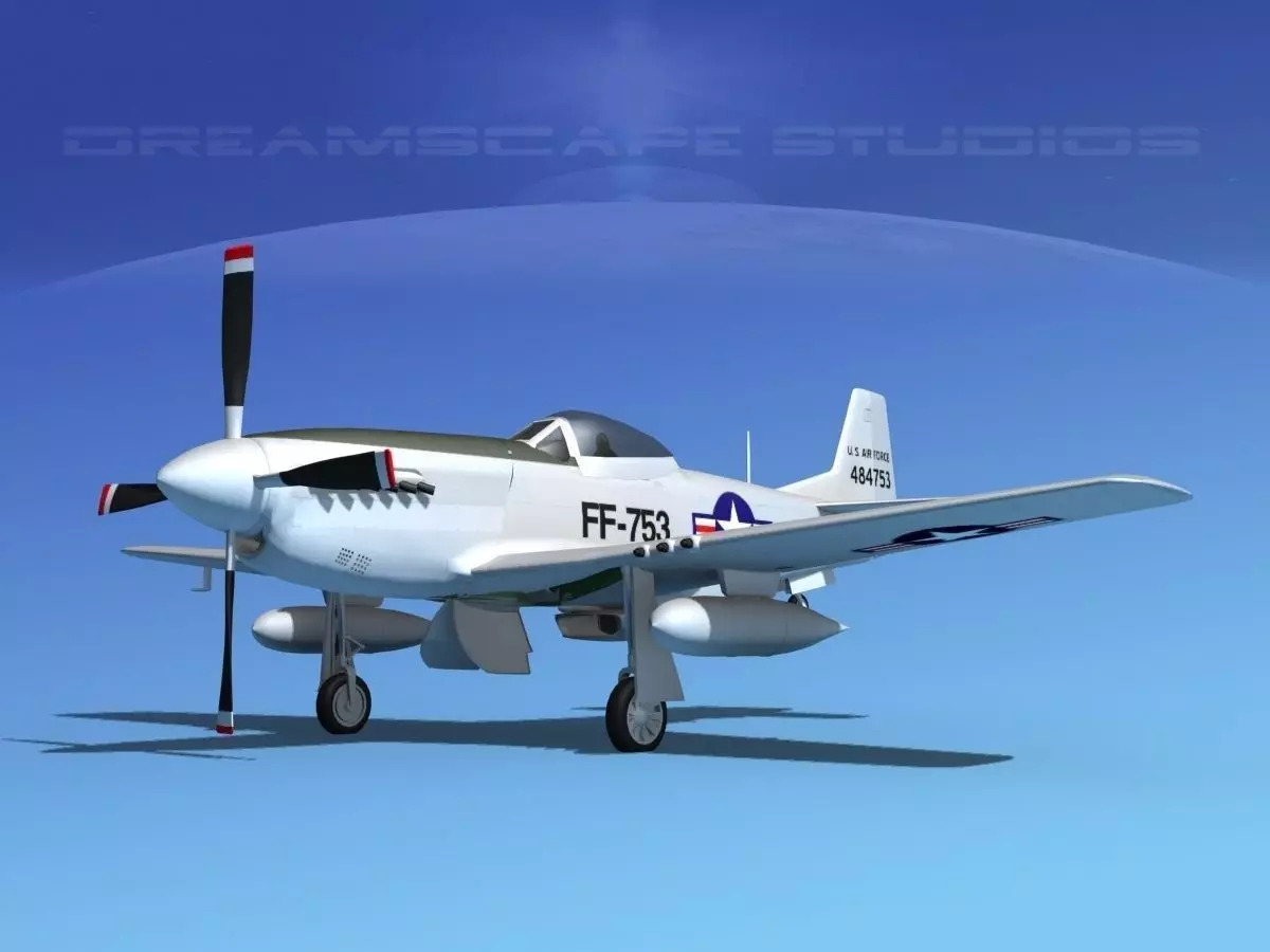 The later upgrade replaced many modeled parts, the textures for the wings and rebuilt the cockpit to include the additional details. Engine, oil reservoir, mounting arms, mounts, oil cleaner intake duct, fuel lines and spark plugs are also modeled. The cowling panels or either side can be removed to reveal the engine. These panels are just like what is found on the real Mustang allowing more realistic views of the aircraft undergoing maintenance. Landing gear features were added and 6 x 50 caliber machine guns, spar, wing fuel tank are included in the wings. You see the rear fuel tank in the fuselage behind the seat. It is provided in different model formats.