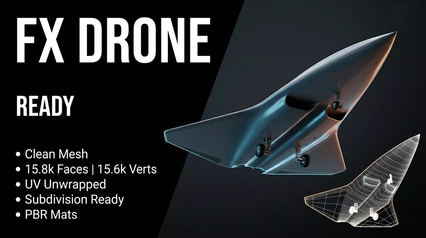 The drone is fully UV unwrapped with a logical, non-overlapping layout that ensures seamless texture application and simplifies the painting process. Complementing the technical precision of the mesh are realistic materials developed directly within Blender, providing a sophisticated, photorealistic finish that reacts naturally to lighting environments. Key functional details include a fully modeled landing gear system, complete with wheels and support struts, and integrated engine intake vents located beneath the fuselage. Whether used as a low-poly asset for real-time engines or a high-poly hero piece in a CGI sequence, this FX Drone model offers the professional quality and aesthetic appeal required for top-tier digital productions.