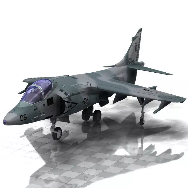 The Hawker Harrier AV-813 is the US Navy version of the worlds only active service vertical take-off and landing jet fighter. This model is rigged for animation, and uses high detail texture maps allowing very close-up rendering.