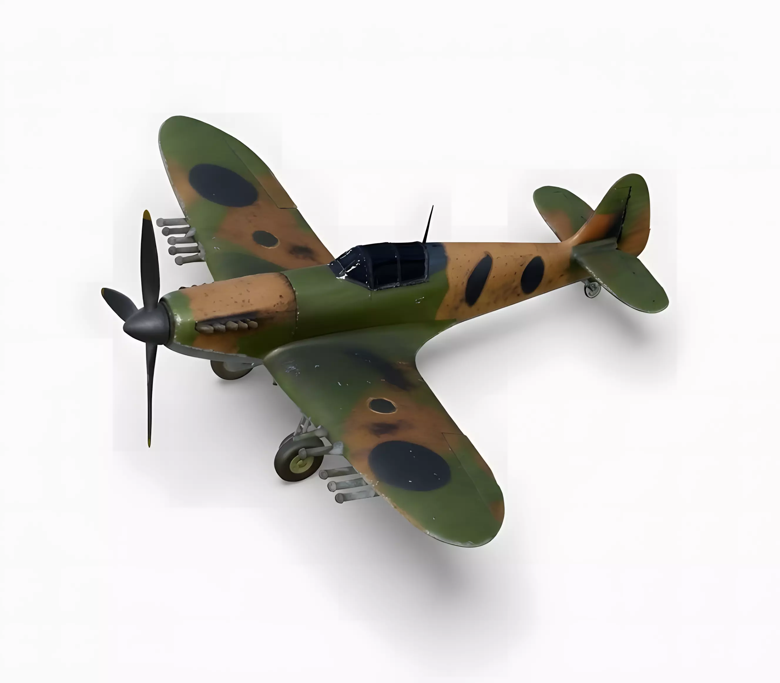 Earth-Tone Camouflage The fuselage is wrapped in a classic green and brown camouflage pattern. This texture creates an authentic Battle of Britain aesthetic, helping the aircraft blend into terrestrial backgrounds during low-altitude flight.