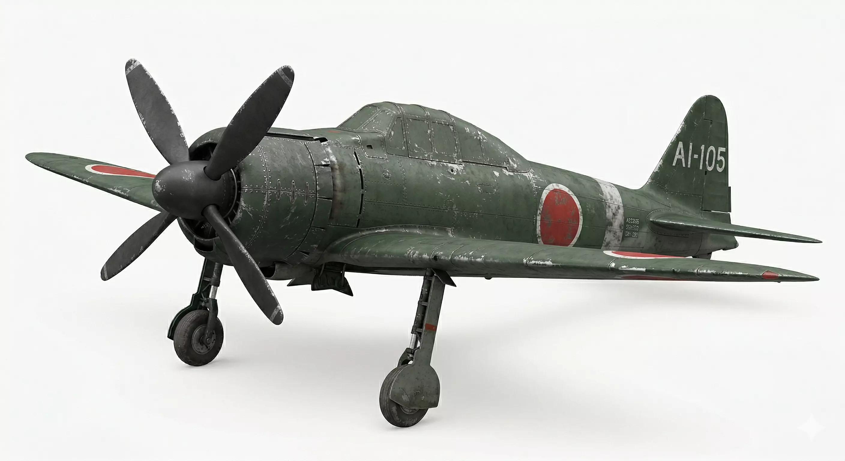 High-Fidelity Nakajima Sakae Engine and Cowling DetailA primary feature of this model is the integrated Sakae radial engine assembly and three-blade propeller. Every individual cooling fin visible behind the cowling, the recessed machine gun ports on the upper nose, and the specialized aerodynamic spinner are modeled with significant surface depth, providing a clear visual indicator of advanced mid-century aviation engineering and adding incredible tactile detail for close-up inspection during carrier-deck or hangar scenes.