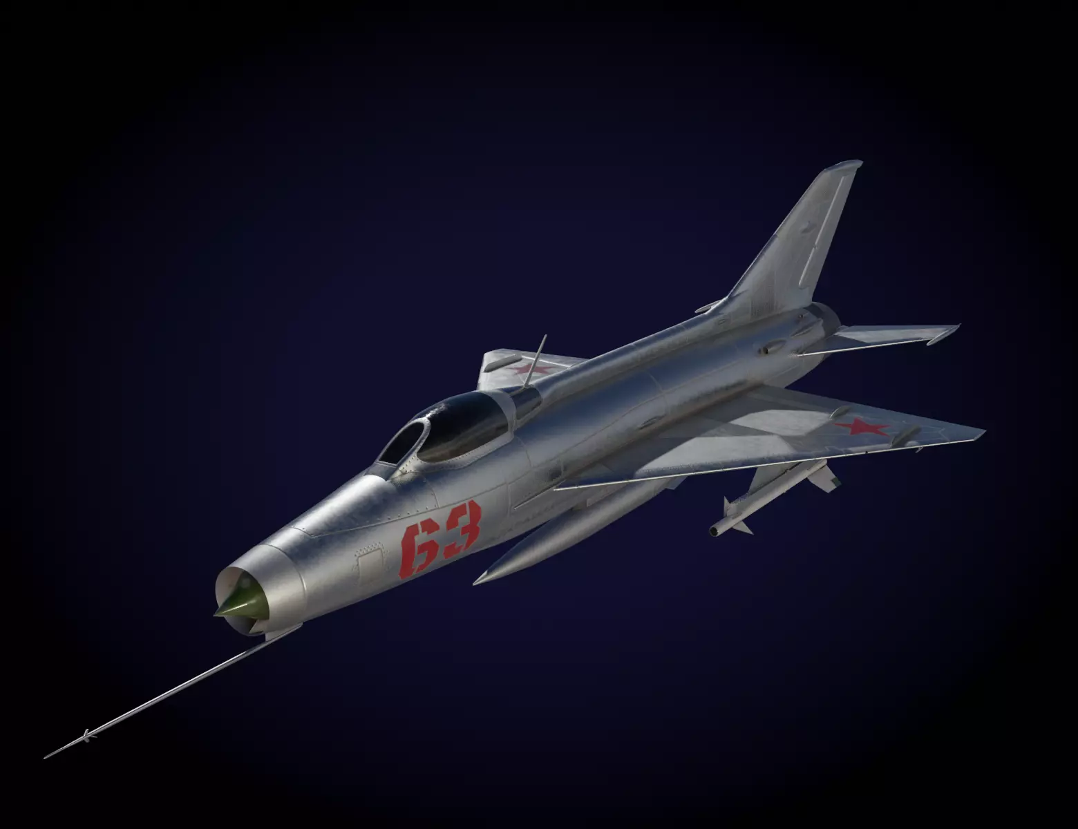 3D model of the F-13 Fishbed-C variation of the soviet MIG-21 fighter jet. With the K-13 Atoll missile and R11 engine. The model is mainly based of the unit in display at Boeing Aviation Hangar.