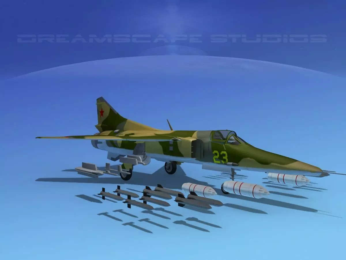 MIG-27 3d model was built very near to scale and it has a very detailed exterior, engine exhaust and after burner section as well as cockpit. It is fully textured including flight instruments and engine exhaust components. In has many animateable features including variable sweep or geometry wings, flaps, flaperons, stabilizers, rudder, wheels, landing gear and landing gear doors, missiles and rockets, opening canopy, throttle and stick, toggle switches and others. It has high quality maps and materials and is available in a wide range of formats. It also comes with a weapons collection and pylons for your addition to the aircraft.