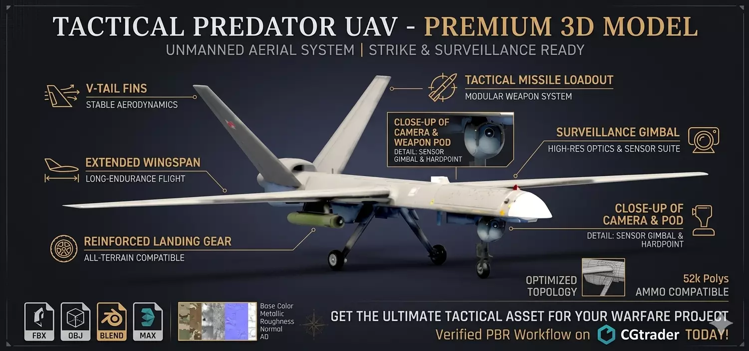 This is a high-fidelity, professional Military UAV (Unmanned Aerial Vehicle) 3D model, inspired by modern tactical predator drones. The model is meticulously crafted for use in combat simulations, stealth mission games, and military visualizations. It features a streamlined aerodynamic design and comes equipped with under-wing tactical equipment.