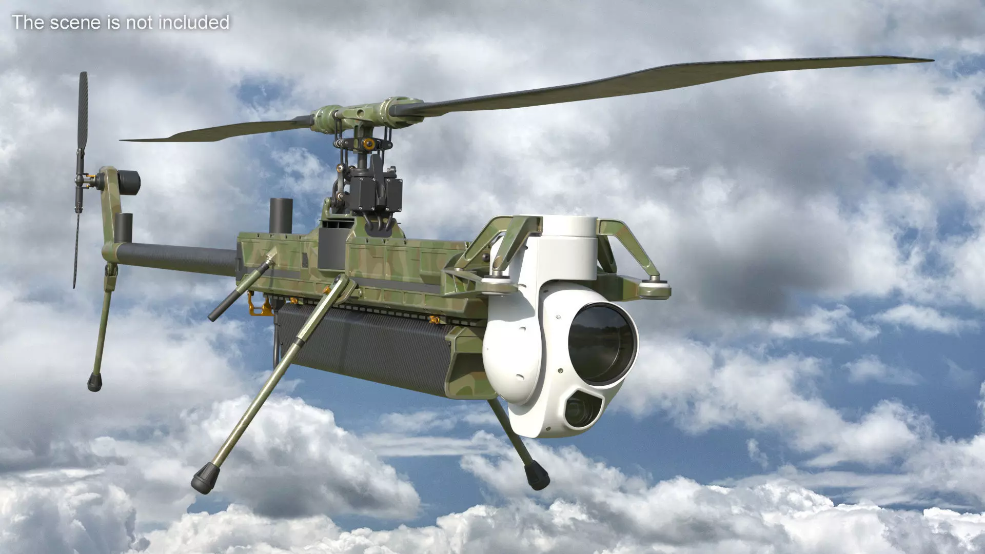 The model showcases a compact design equipped with state-of-the-art optics and sensors, enabling high-resolution imaging and data collection. Its rotorcraft structure allows for vertical takeoff and landing, increasing versatility in various terrains. The UAV's stealthy build and advanced materials ensure it can operate efficiently while maintaining low visibility.