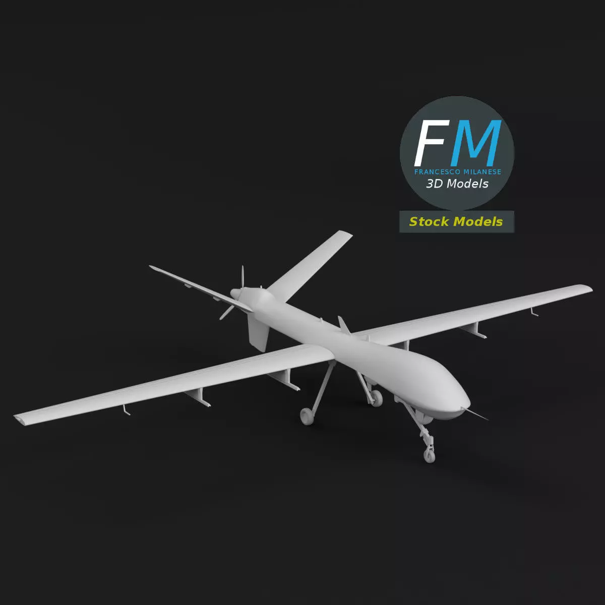 Stylized medium-altitude long-endurance reconnaissance UAV drone 3D Model base mesh inspired by modern military unmanned aerial vehicles. Suitable for simulations, games, visualization and concept scenes. 3 individual objects (uav, gears, fan; so, you can easily remove the gears (to get an airborne version) or animate the fan), sharing the same non overlapping UV Layout map, Material and PBR Textures set. Production-ready 3D Model with non overlapping UV Layout map provided in the package. PBR Materials and Textures (Metallic Workflow: Base Color, Metallic, Roughness, Normal) embedded in the Blend, FBX, and GLB files.Easily customizable: UV unwrapped geometries; UV Layout maps provided in the package as png with alpha images.Quads-only geometry.Made with Blender 5 with Cycles Principled BSDF (PBR, Metallic Workflow) Material, then exported to other formats (OBJ, FBX, GLB; FBX and GLB have embedded textures).Promo images: some renderings made with Cycles for Blender, plus Wireframes and Blender screenshots (Object Mode, Edit Mode with UVs).Formats included: FBX with embedded PBR Textures (Metallic Workflow: Base Color, Metallic, Roughness, Normal), GLB with embedded PBR Textures (Metallic Workflow: Base Color, Metallic, Roughness, Normal), OBJ; scenes: BLEND (with Cycles Principled (PBR) Materials); other: 16-bit PNGs with Alpha.3 Objects (meshes), 1 PBR Material, UV unwrapped (non overlapping UV Layout map provided in the package).UV Layout maps and Image Textures resolutions: 2048x2048.Polygonal, QUADS-ONLY, 57273 vertices, 57141 quad faces (114282 tris).Real world dimensions; scene scale units: METERS in Blender 5 (that is: Metric with 1.00 scale).Uniform scale object (scale applied in Blender 5).PBR Textues included: in a zipped folder, you'll find the PBR Textures set (as 16-bit PNGs with Alpha).IMPORTANT --- Main renderings made with Blender 5 + Cycles using an HDR Environment Texture Image which is NOT provided in the package!