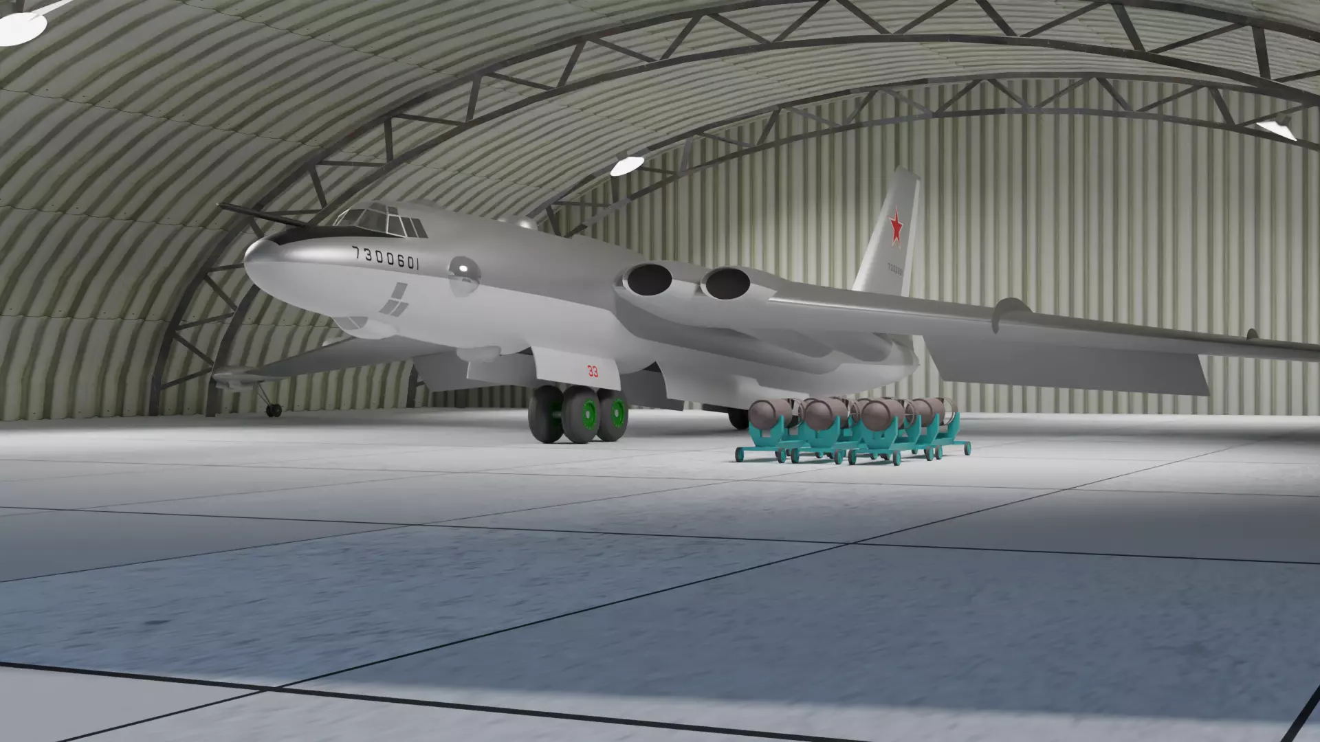 This model is rigged, and features rigs for the refueling probe, landing gear, bomb bay, turrets (dorsal, ventral and tail), flaps, ailerons, elevators and rudder. There are 6 FAB-3000M-46 bombs situaded in the bomb bay.