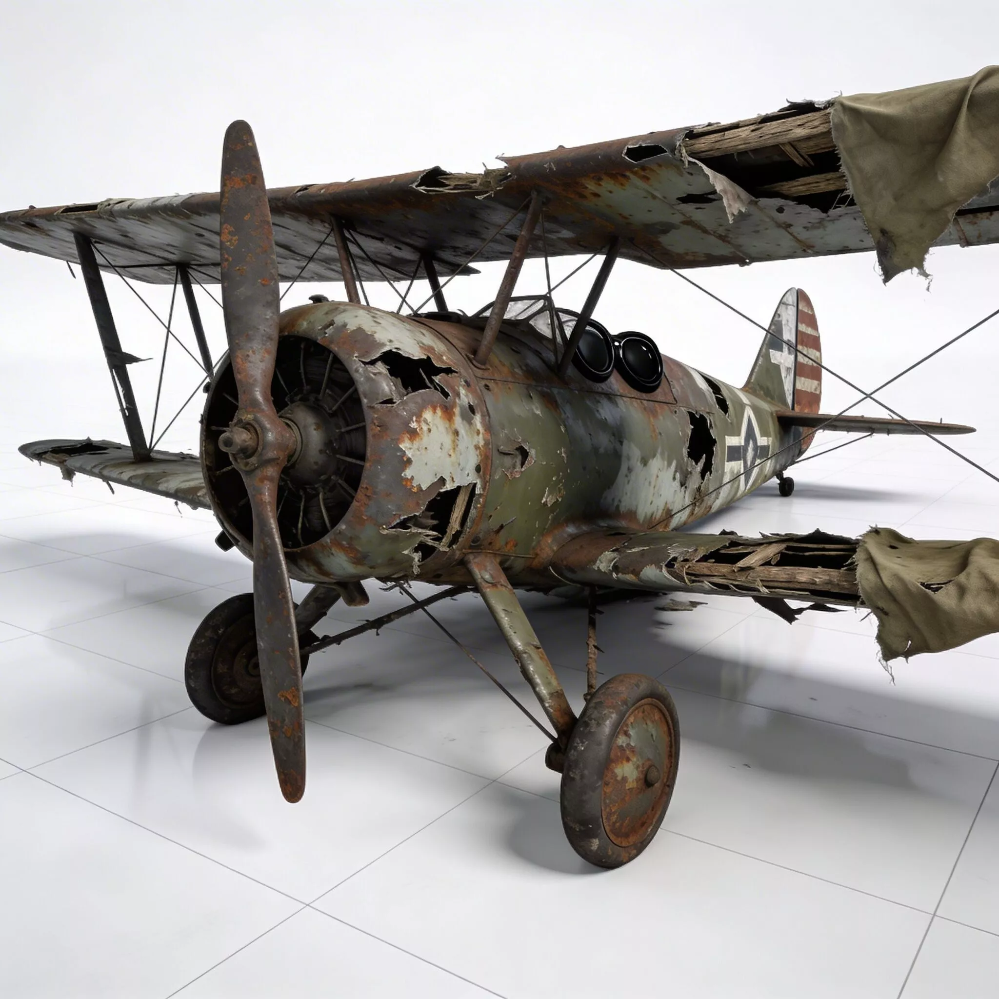 High-Fidelity Ballistic Damage and Shredded Wing AssemblyA primary feature of this model is the integrated massive wing breaches and jagged fuselage punctures. Every individual entry-hole on the wings, the exposed wooden internal ribbing, and the jagged, torn metallic edges where the duralumin skin has been catastrophically breached are modeled with significant surface depth, providing a clear visual indicator of heavy-caliber impact and adding incredible tactile detail for close-up inspection.