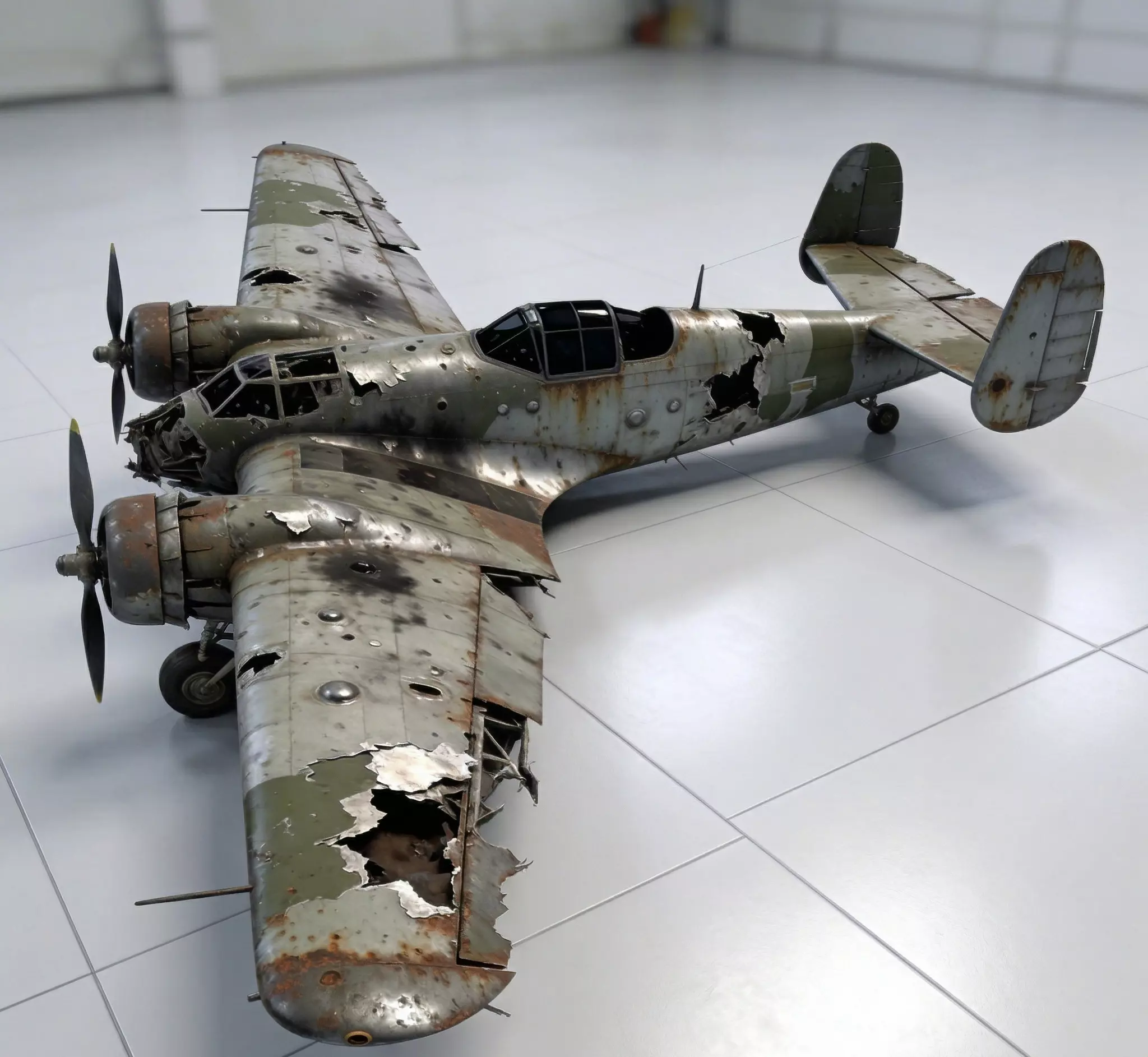 Weathered Aluminum and Peeling Green Camouflage FinishThe aircraft features a primary body finish of heavily oxidized natural aluminum and tattered olive-drab paint, meticulously modeled with realistic surface pitting, massive iron-oxide crusting along the wing-roots, and prominent weather-beaten tarnish. This professional and grounded appearance provides a clear visual story of decades of environmental exposure and abandonment after a combat landing, providing a sharp visual contrast against the dark internal shadows of the fuselage breaches and cockpit glass.