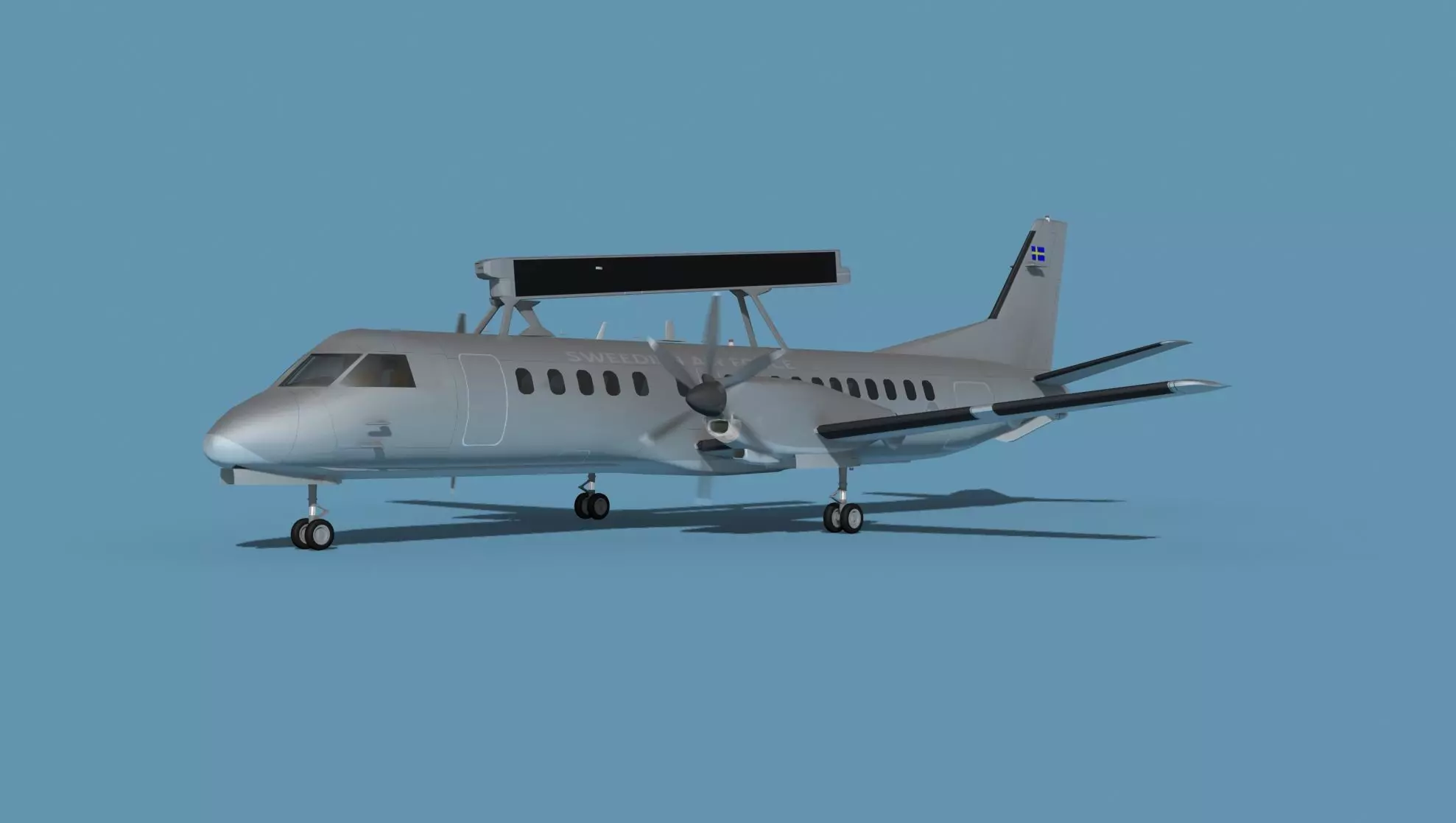 The SAAB SA2000 Erieye AEWAC airborne early warning and control aircraft is a military variant of the standard SAAB SA2000 regional airliner equipped with a spine mounted Erieye PS-890 side looking radar. It is used to watch over an airspace for income threats and or to control ground and air assets for military operations.