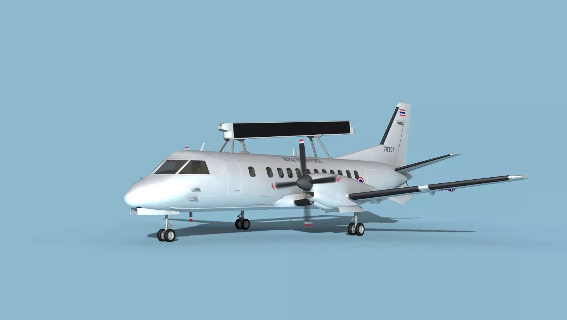 SAAB developed this small airliner into an AEWACS (airborne early warning and control) aircraft for the Swedish air force and for international sales. Its first flight was in 1994. It is currently active in Pakistan, Sweden, Thailand, and United Arab Emirates. It is currently active. In production in 1994 through 1999 with 12 being built.The model was built near to scale in real units and built based on drawings, photos, and other documents. This model has a moderately detailed cockpit and the following animateable features; ailerons, split flaps, elevators, rudder, propeller (is animated), canopy, landing gear, and landing gear doors.These models render very well and look very realistic using good animation, lighting and rendering technique. It can be used in an animated or static position within a scene, animation or animated video, or possibly programming for a flight simulation application. This model was not designed for 3d printing, these are to be used as digital files only. If you purchase one for digital printing we do not guarantee that your print will be successful.Exporting of models is limited but good for several software applications. This model is fully textured with all materials UVW mapped and applied. Most materials are planar mapped and major materials include texturing. All textures and materials are included as shown. Objects are logically named for ease of scene management.No cleaning up necessary, just drop your models into the scene and start rendering.No special plug-ins are needed to open scene.In most cases the liveries are based on actual service liveries or paint schemes. Many of the units, airlines or countries who flew the plane are represented here. Dreamscape Studios is a US 3d modeling firm specializing in building high definition, accurate, and detailed 3D models of commercial, civilian, and military airplanes, ships, buildings and other subjects.Dreamscape 3d models are built in ultra-low to ultra-high polygon count, (most often) near to scale and include a good amount of detail based on the resolution target. If you have a question, error or problem with the model, let us know and we will do our best to provide or get a solution for you. Be advised our models are not designed for 3d printing unless they are advertised for that purpose.
