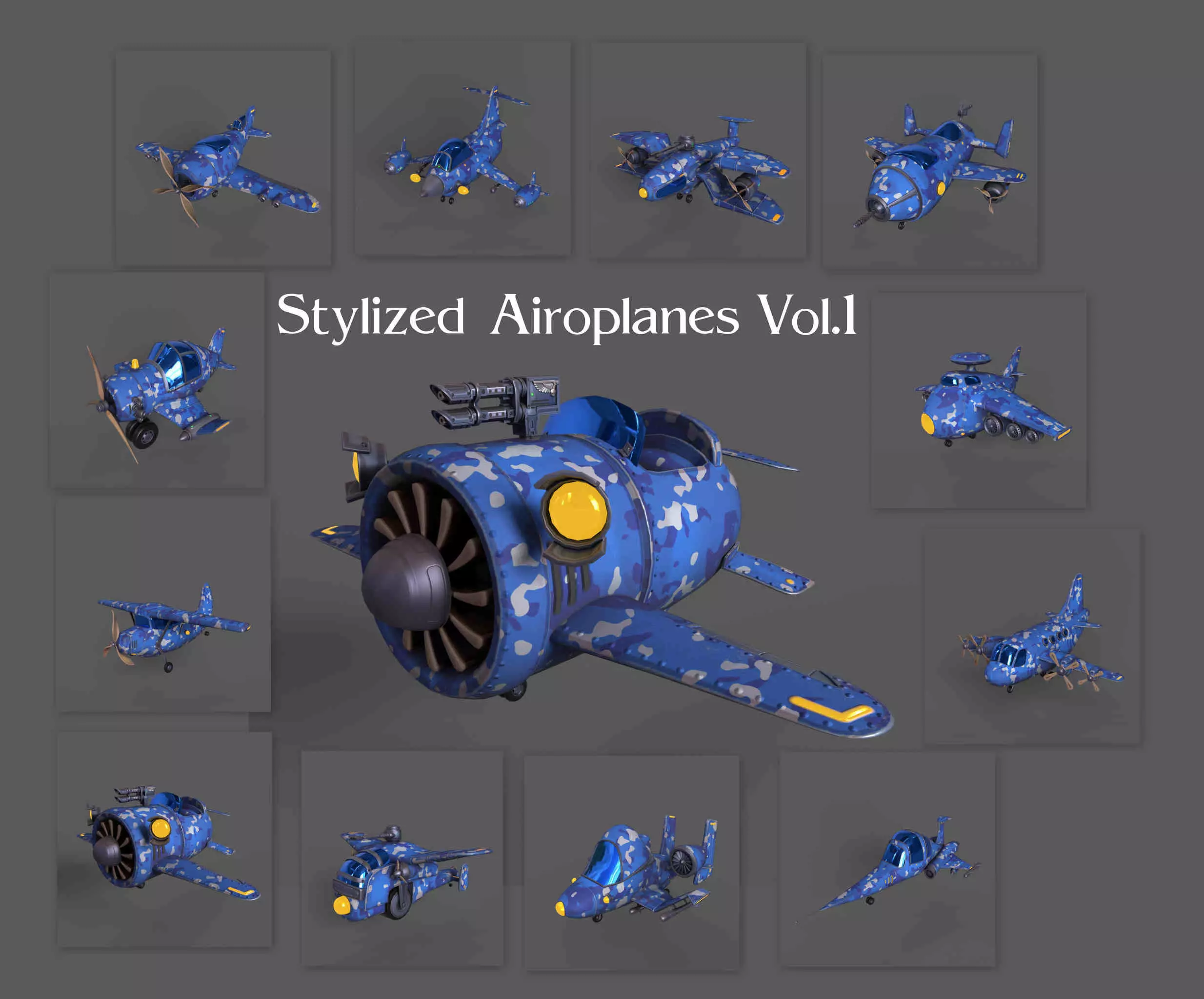 Twelve high quality lowpoly 3d model of stylized toon airoplanes to decorate your game environment in Unity and UnrealEngine editors.The models is logically divided into separate parts.The models are made with much attention to details. They have reasonable amount of polygons and accurate grid.Geometry: Units: Centimeters Object: Material count: 2-5 materials depending on model type Unwrapped UVs;Texture set: Painted in Substance Painter PBR textures .png/4k Available formats: *.fbx/.obj