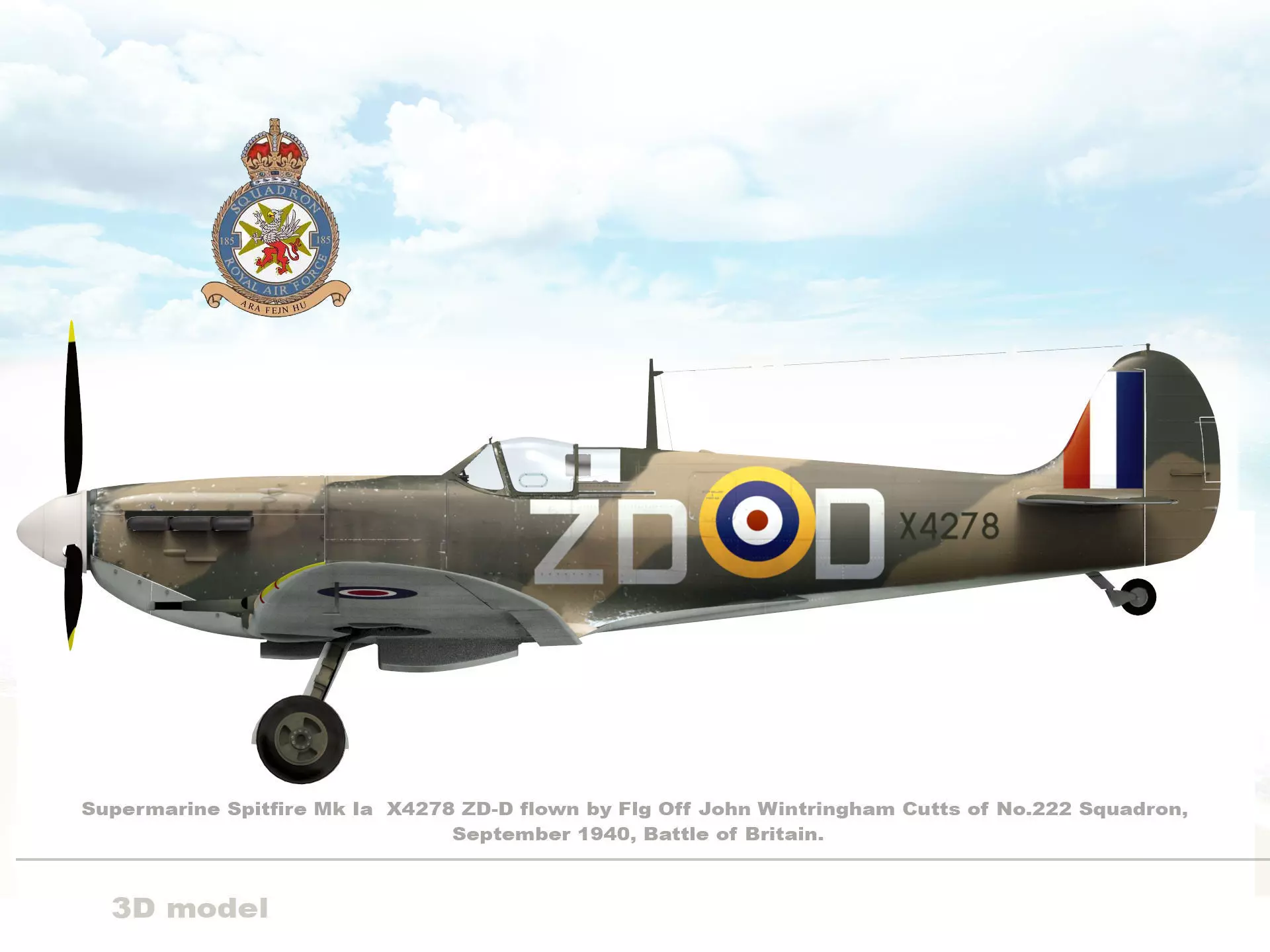 The 3d model was designed according to a real fighter aircraft: Supermarine Spitefire Mk Ia X4278 ZD-D flown by Flg Off John Wintringham Cutts of No.222 Squadron, September 1940, Battle of Britain.