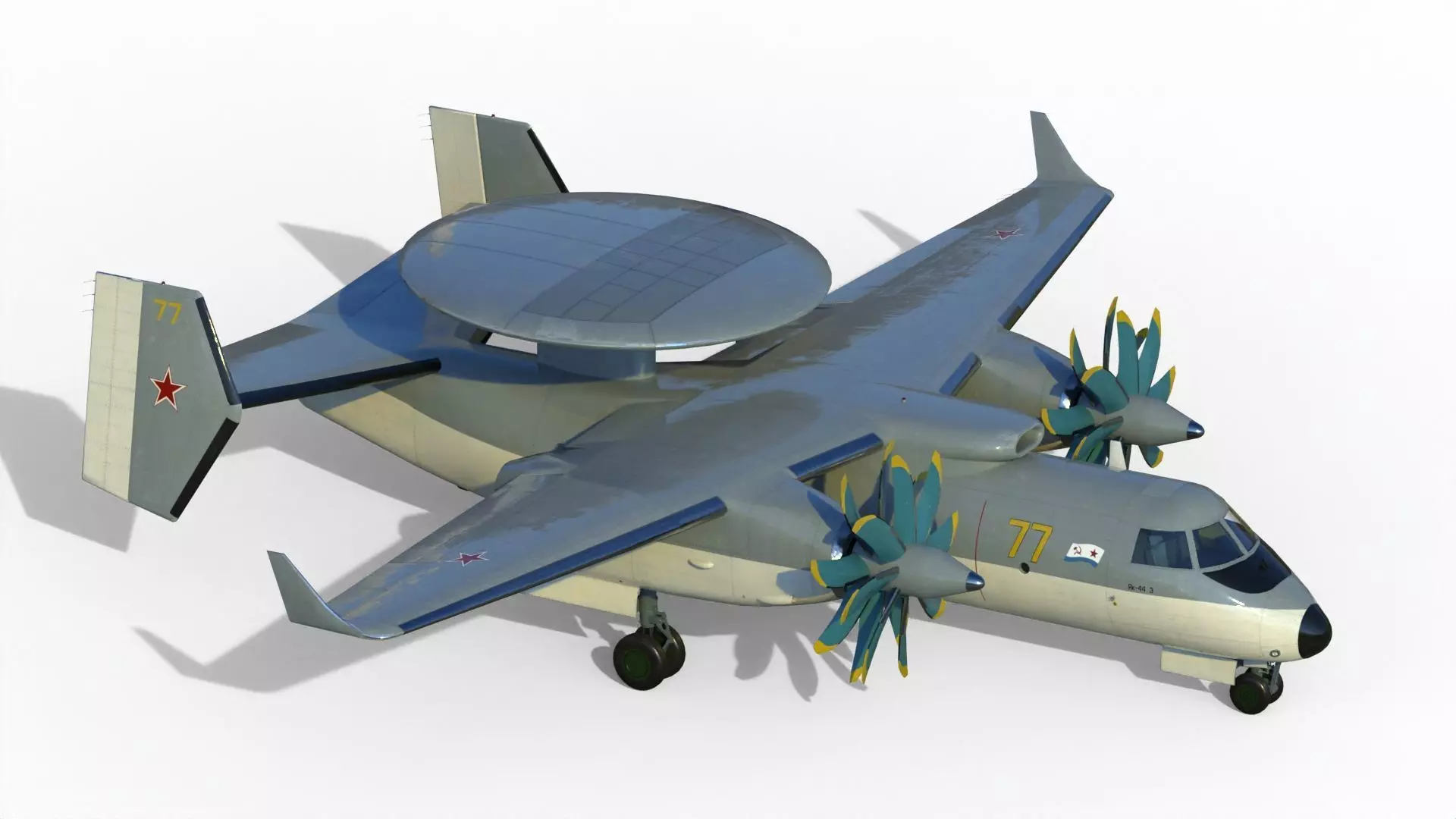 The Yakovlev Yak-44 (Russian: Як-44) was a proposed twin-turboprop Airborne Early Warning (AEW) aircraft, resembling the United States Navy’s E-2 Hawkeye, intended for use with the Soviet Navy’s Ulyanovsk class supercarriers. Along with the aircraft carrier it would have flown from, the Yak-44 was cancelled after the demise of the Soviet Union. A full-scale mockup with foldable wings was built.