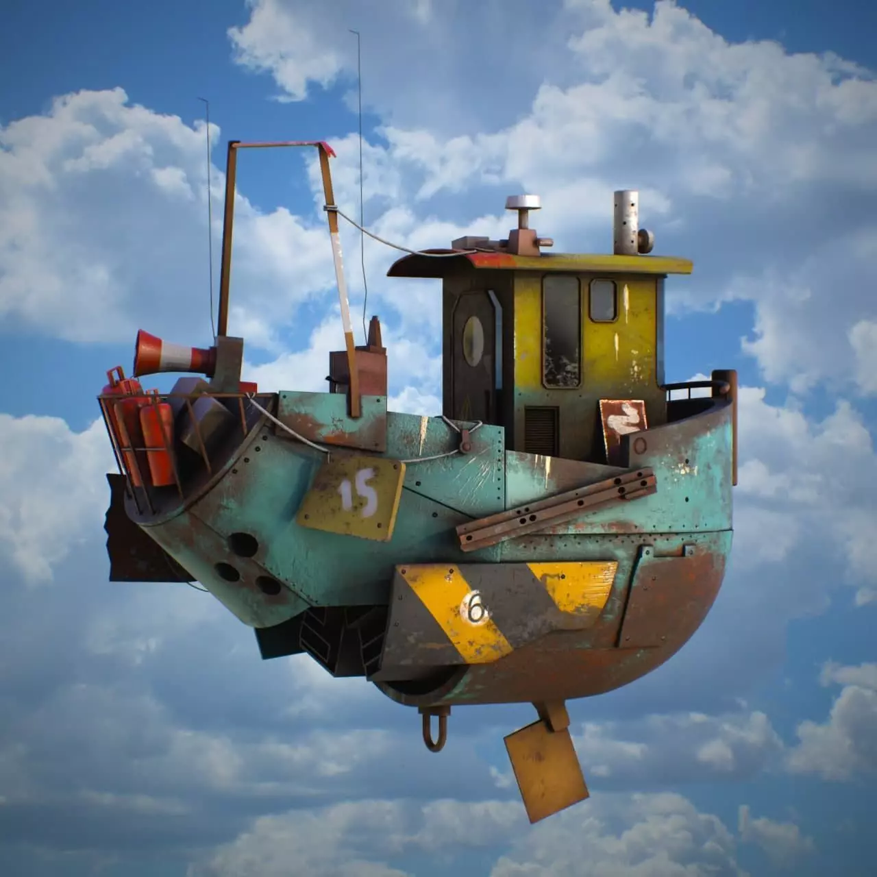 Fly Boat transport. If you are a fan of Borderlands or Mad Max style, I hope you will like it. This model were originally modeled in 3ds Max 2016 with use of Physical matterials (PBR).Approx. sizes:L7 x 3.6W (Meters)L275 x 140W (Inches)