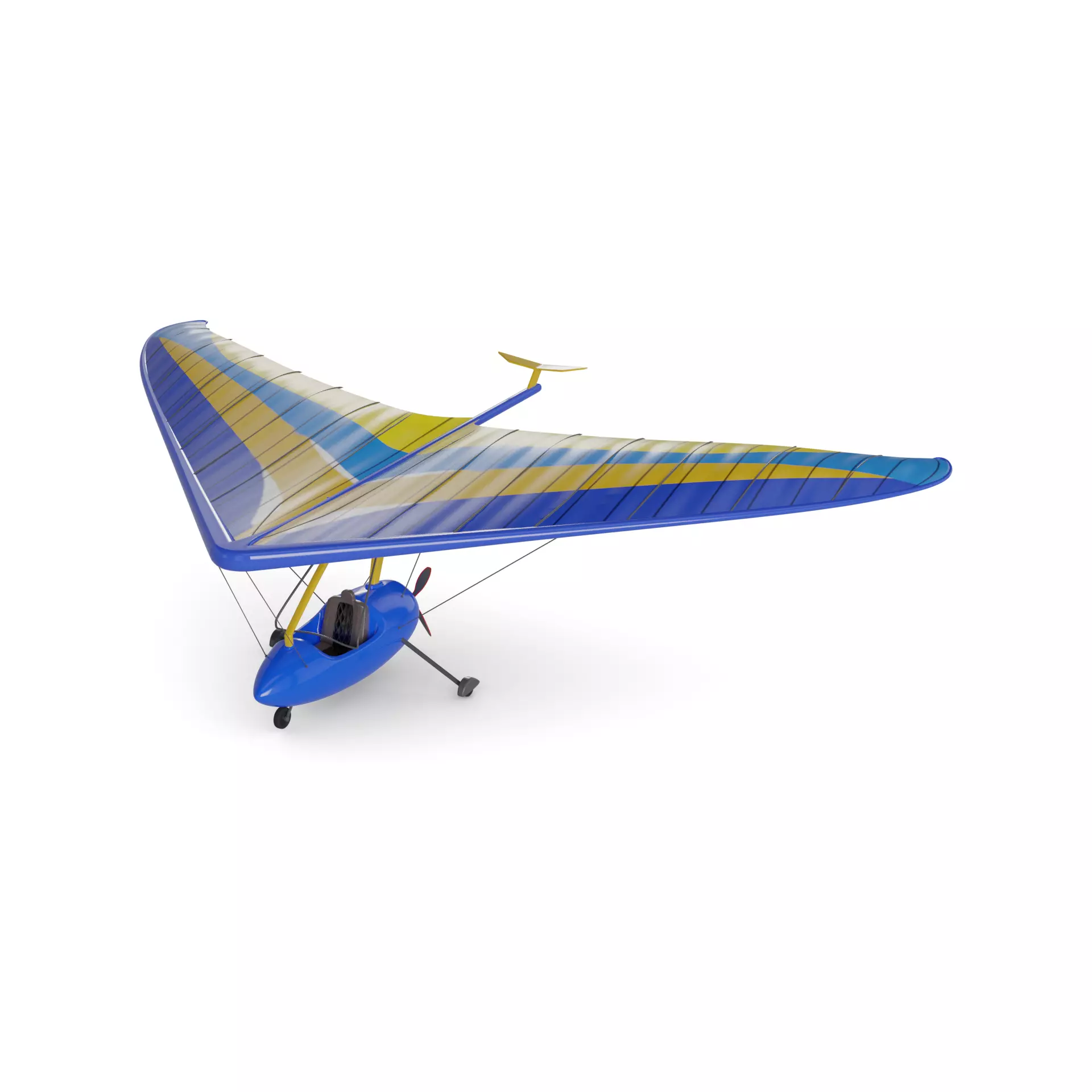 A modern hang glider in a striking blue and yellow color scheme, perfect for recreational flying in the current timeline. The wings are long and graceful, allowing for smooth gliding through the air.