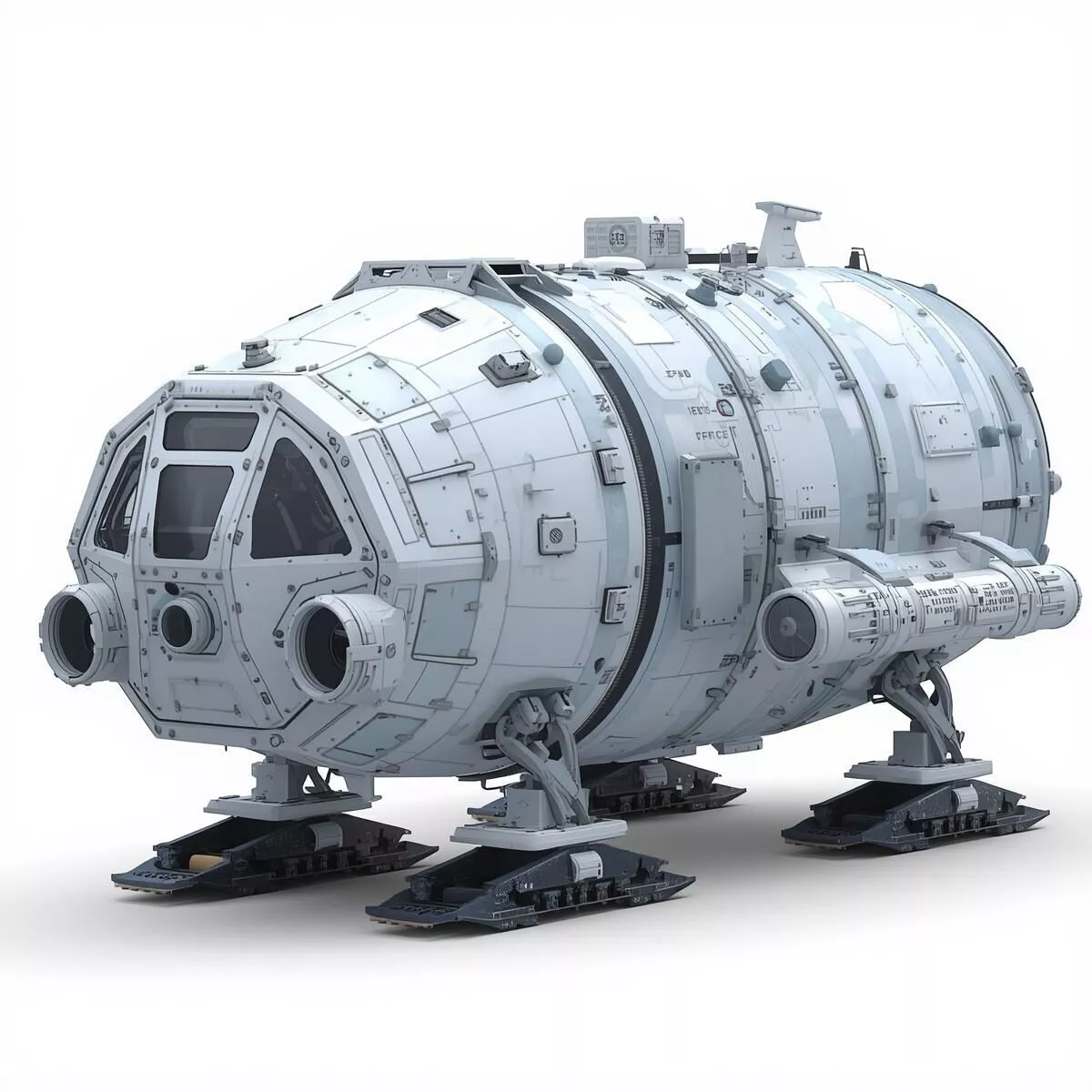 The realistic sci-fi arctic command module is a highly detailed 3D asset designed for polar research stations, deep-space colony simulations, or frozen planet survival games. Constructed with a heavy-duty, pressurized cylindrical hull, the vessel features a pristine white and light grey panelized armor plating designed to withstand extreme sub-zero temperatures. The forward section houses a multi-paned reinforced cockpit with a unique octagonal frame, flanked by dual atmospheric sensor pods or small thrusters. Instead of wheels, the module is supported by a robust quad-ski landing system, utilizing heavy-duty articulated legs and wide, dark-colored skis for stability on ice and snow. The exterior is detailed with various service hatches, top-mounted communication arrays, and subtle technological decals. Presented as a complete, full studio shot from a dynamic three-quarter perspective on a pure white background, emphasizing its utilitarian industrial design and advanced aerospace engineering.