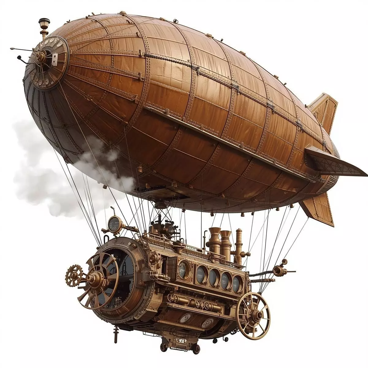 Intricate Mechanical Gondola: Showcases a high-detail engine bay with visible rotating gears, multi-blade propellers, and an array of copper piping.