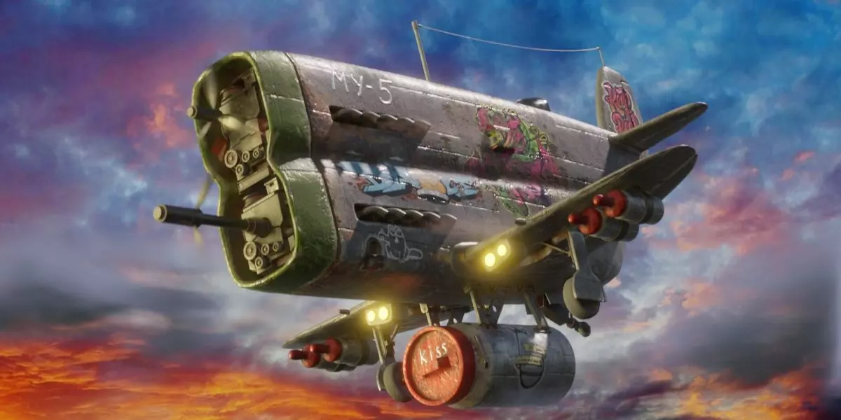 A stylized realistic airplane with various elements of wear and tear such as rust, scratches, old paint on top of other old paint, dirt, graffiti, lettering and sooted fuel streaks!