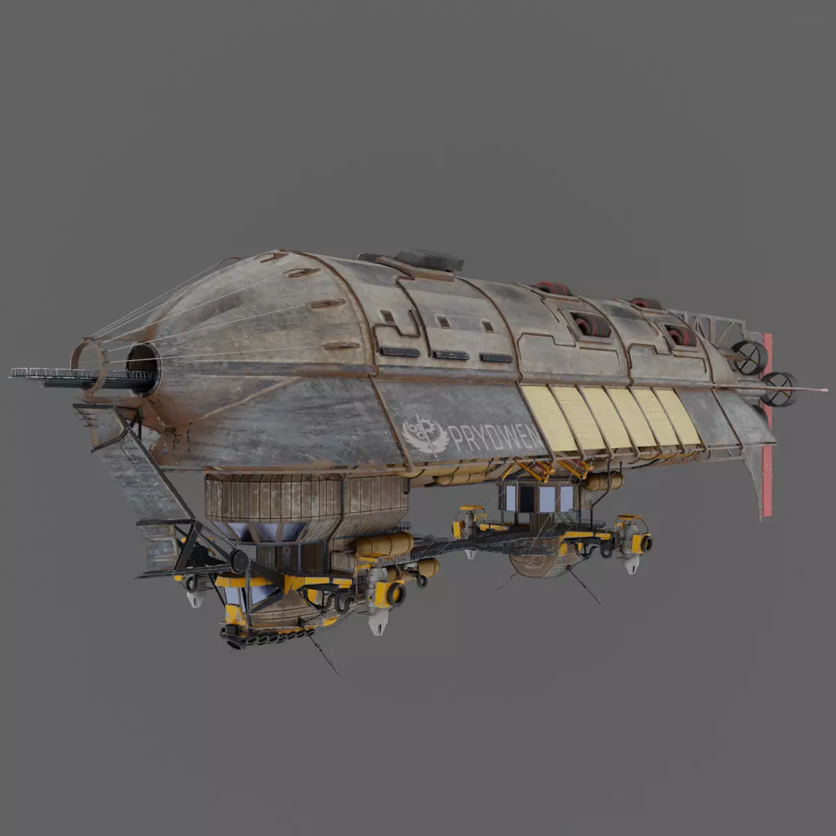 The Prydwen from Fallout 4 is an imposing airship converted from a military vessel and utilized by the Brotherhood of Steel as a mobile base. The airship features a massive armored hull with distinctive white and gray hues and the iconic emblems of the Brotherhood of Steel. At its top sits a command bridge, and on its sides are weapon turrets. The Prydwen is also equipped with platforms for helicopters and troop deployment, making it a mobile and formidable force in the post-apocalyptic world.