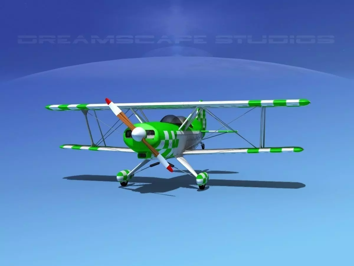 Acro Sport Biplane is built near to scale, highly detailed and includes many great features. First the model includes textures for the fabric covering, sewing and for leading edge smooth areas where plywood leading edges are used. The cockpits include complete instrumentation, materials for the gauges, switches, controls and knobs. Rudder peddles are also included. Structural flying wiring is modeled on the wings, tail and stabilizer. The ailerons on (bottom and top wings) elevators, rudder, and the propeller are animatable. Pull the cowling off to reveal a nearly complete engine compartment with a 4 cylinder opposed inline, air intakes, starter, flywheel and mounts. Cooling plates are also modeled.