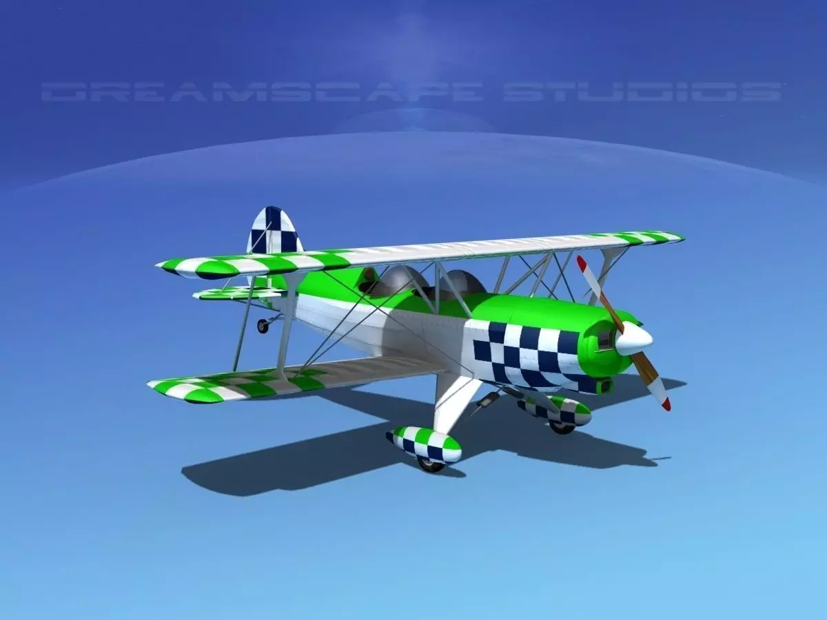 Acro Sport Biplane is built near to scale, highly detailed and includes many great features. First the model includes textures for the fabric covering, sewing and for leading edge smooth areas where plywood leading edges are used. The cockpits include complete instrumentation, materials for the gauges, switches, controls and knobs. Rudder peddles are also included. Structural flying wiring is modeled on the wings, tail and stabilizer. The ailerons on (bottom and top wings) elevators, rudder, and the propeller are animatable. Pull the cowling off to reveal a nearly complete engine compartment with a 4 cylinder opposed inline, air intakes, starter, flywheel and mounts. Cooling plates are also modeled.