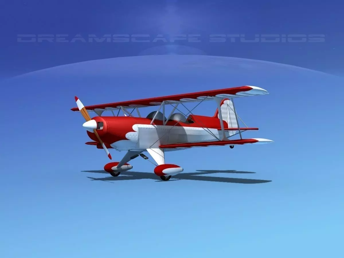 Acro Sport Biplane is built near to scale, highly detailed and includes many great features. First the model includes textures for the fabric covering, sewing and for leading edge smooth areas where plywood leading edges are used. The cockpits include complete instrumentation, materials for the gauges, switches, controls and knobs. Rudder peddles are also included. Structural flying wiring is modeled on the wings, tail and stabilizer. The ailerons on (bottom and top wings) elevators, rudder, and the propeller are animatable. Pull the cowling off to reveal a nearly complete engine compartment with a 4 cylinder opposed inline, air intakes, starter, flywheel and mounts. Cooling plates are also modeled.