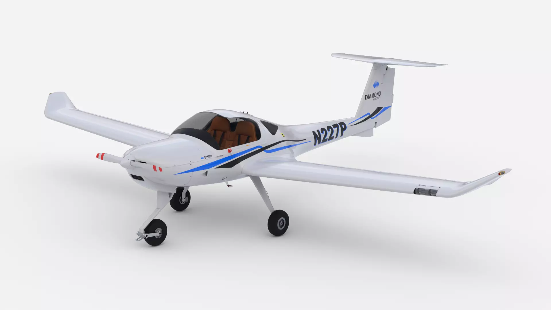 This Diamond aircraft 3D model includes both a detailed exterior and a fully modeled interior. Several components are designed to be movable and ready for animation. In the cockpit, the instrument gauges have rotatable needles that can represent speed, altitude, tilt, and other flight data.