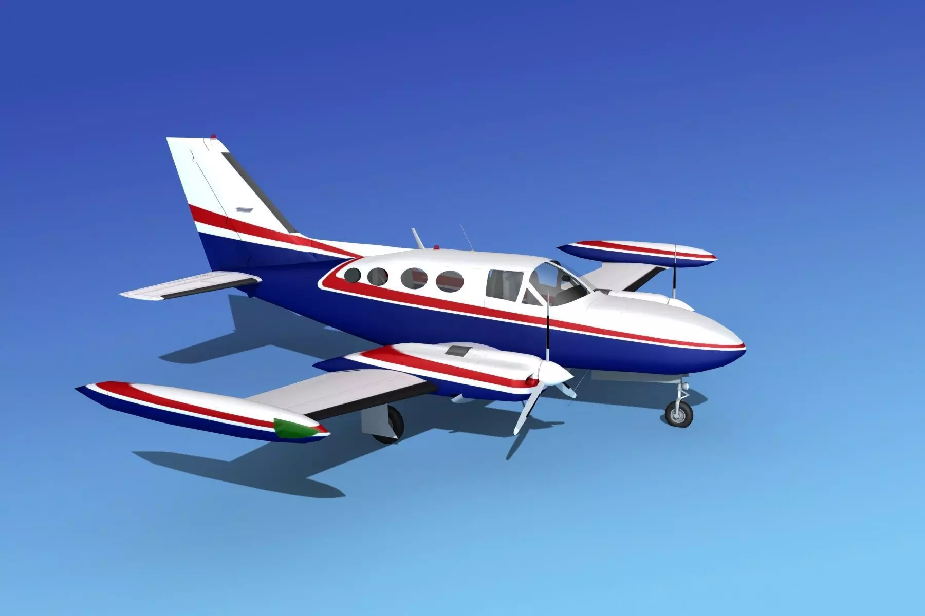 This model is built near to scale within a few inches of actual general dimensions in detail and fully textured. It hasmany animatable features including flaps, elevators, rudder, ailerons,propellers, landing gear and doors. The cockpit is viewable from the exterior showing detail. The interior cabinseating is also included. This model is also available in a wide range of formats . The Cessna 421 Golden Eagle is a further development of theearlier Cessna 411. It is a light twin-engine personal civilian transport aircraft. The Cessna 421 has seating for 6 passengers and crew. It can be flown by one or two crew members. The Cessna 421 uses Continental GTSIO-520-D engines. The propeller isgeared to reduce rpm off the crankshaft of the engines. The 421 a models were produced beginning in1967 and was redesigned and marketed in 1970 as the 421B. Some 421s were modified to accept the turboprop engines which made them very much like the Cessna 425.