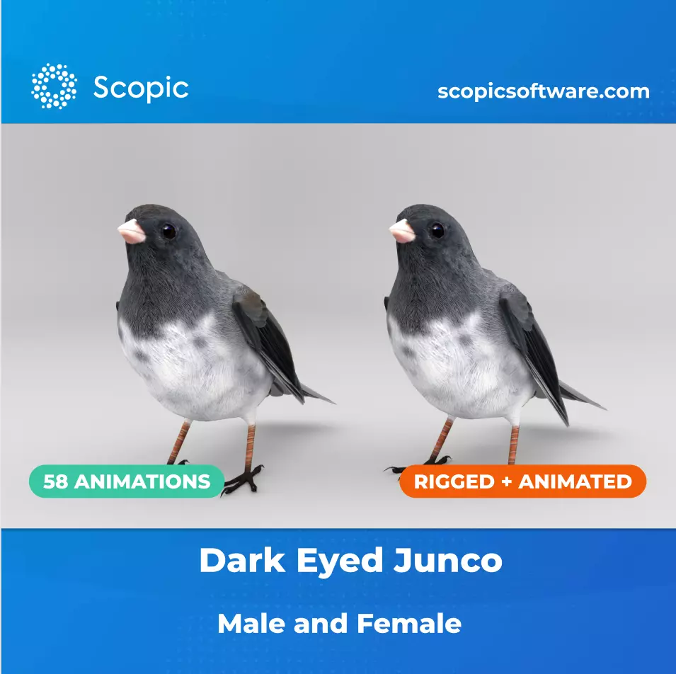Animated 3D Model of Dark Eyed Junco. The model is rigged in Maya and includes various modular animations, perfect for creating custom scenes with ease. You can find both male and female textures included as well as folded and unfolded wing poses. The textures were created with great attention to detail, providing you with accurate and realistic 3D bird models.