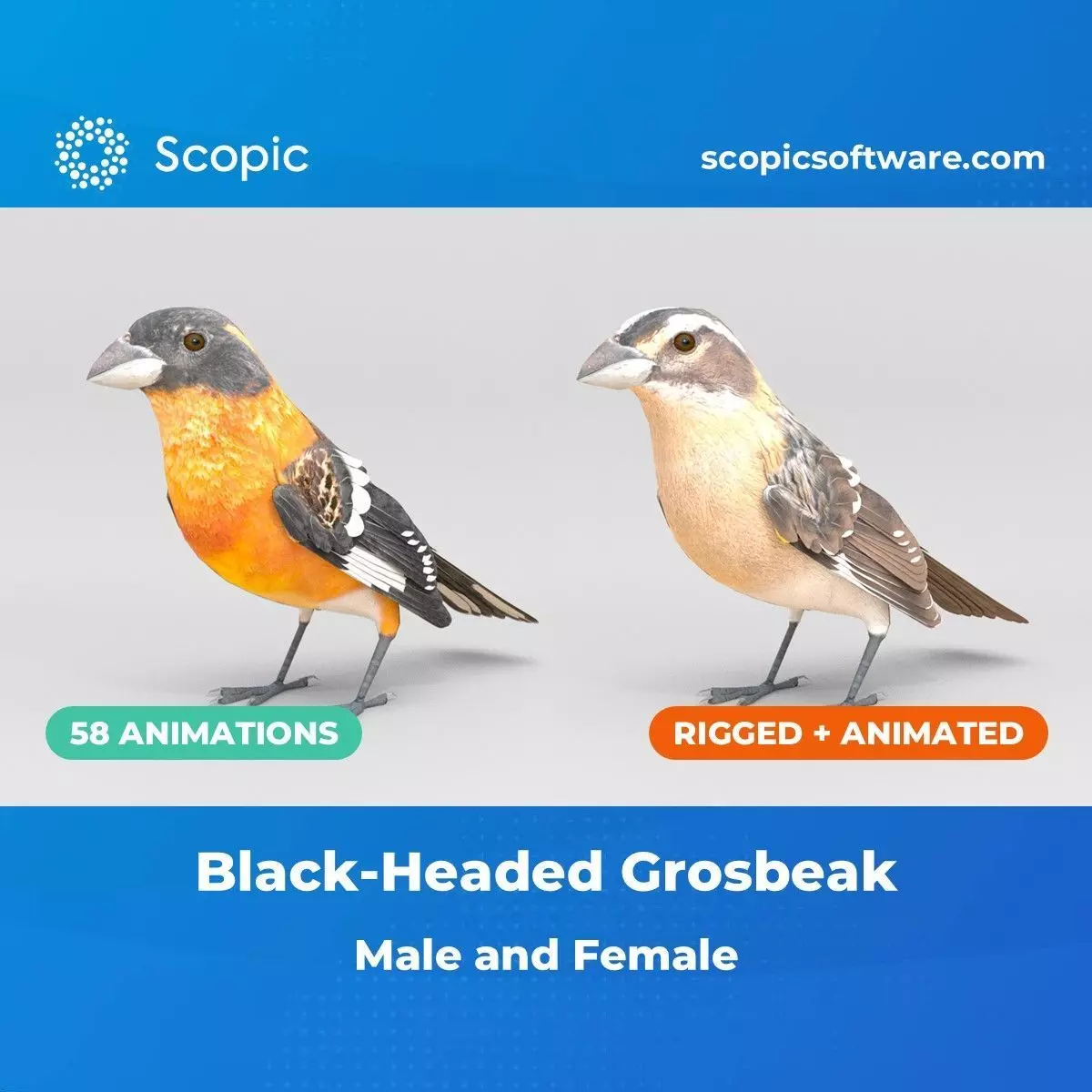 Animated 3D Model of the Black Headed Grosbeak. The model is rigged in Maya and includes various modular animations, perfect for creating custom scenes with ease. You can find both male and female textures included as well as folded and unfolded wing poses. The textures were created with great attention to detail, providing you with accurate and realistic 3D bird models.