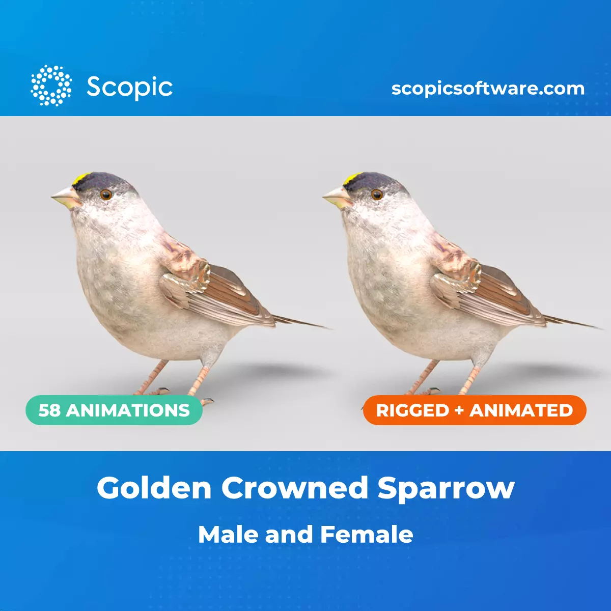 Animated 3D Model of Golden Crowned Sparrow. The model is rigged in Maya and includes various modular animations, perfect for creating custom scenes with ease. You can find both male and female textures included as well as folded and unfolded wing poses. The textures were created with great attention to detail, providing you with accurate and realistic 3D bird models.