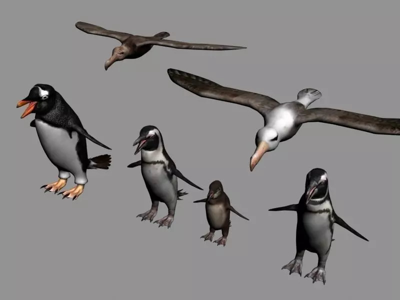 Six realistic antarctic animals. Species: Jackass (both adult and chick), Magellanic, Gentoo, an albatross and a petrel. Each model has high-resolution uncompressed texture files, saved in .tif format. As you can see from the last thumbnail, the scene is organized and transparent. Textures work with the scanline and mental ray renders. Made in 3ds max 2009.