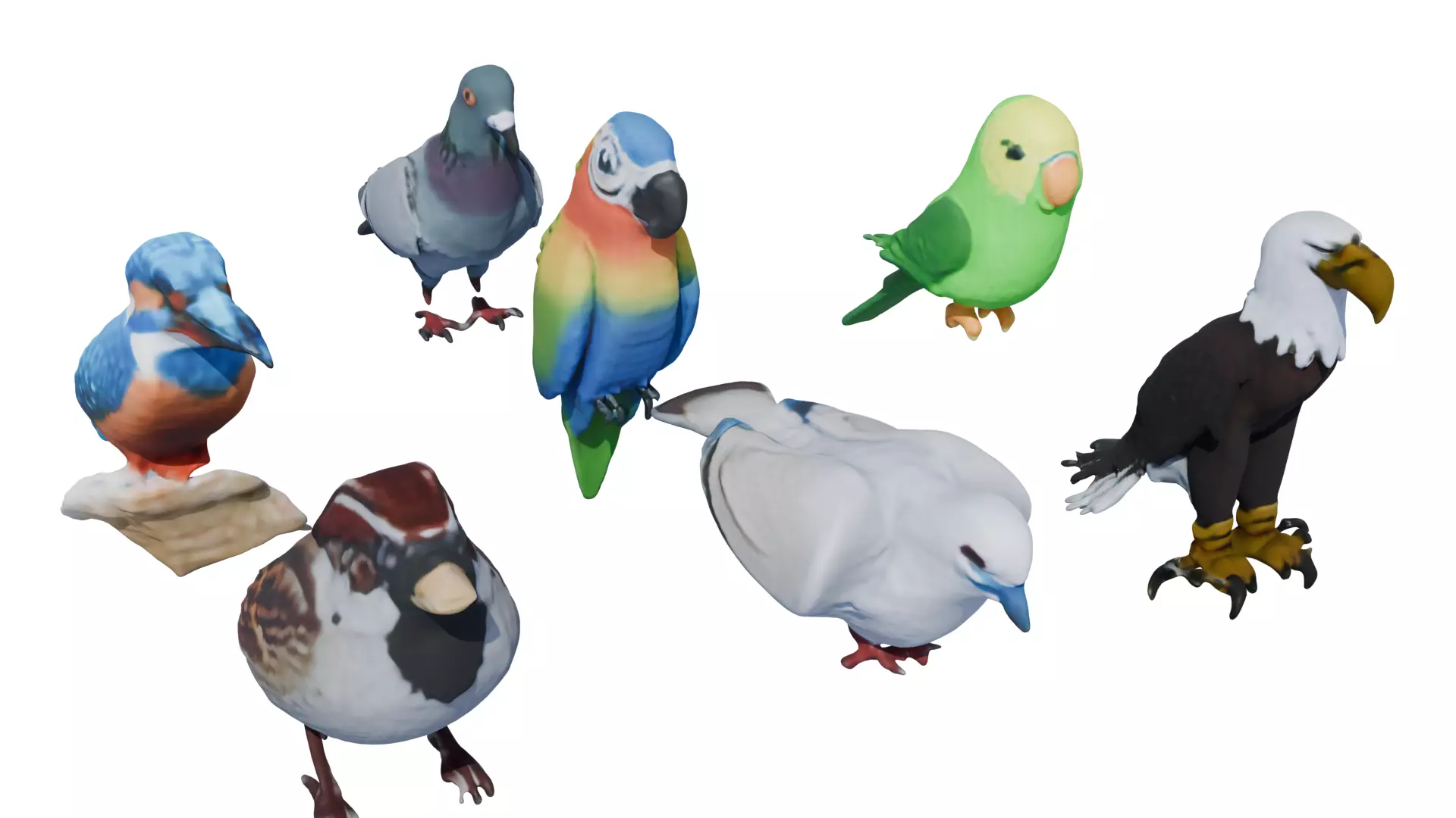 The Avian Spectrum Pack features seven detailed bird 3D models, each representing a distinct species: dove, kingfisher, pigeon, parrot, parakeet, eagle, and sparrow. Crafted with high-poly geometry, these models showcase vibrant plumage, natural proportions, and stylized detailing, making them ideal for cinematic renders, concept art, and educational projects. While not rigged or animated, the collection emphasizes strong visual presence and diversity, offering a versatile set of assets for creative storytelling.All models include PBR textures, with a separated 2K color map and combined roughness/metallic maps for realistic shading and material definition. The pack is delivered in multiple formats—FBX, OBJ, BLEND, STL, GLTF, and MTL—ensuring broad compatibility across pipelines and workflows. This collection is perfect for artists, designers, and educators seeking high-quality avian assets for sci-fi, stylized, or realistic projects.