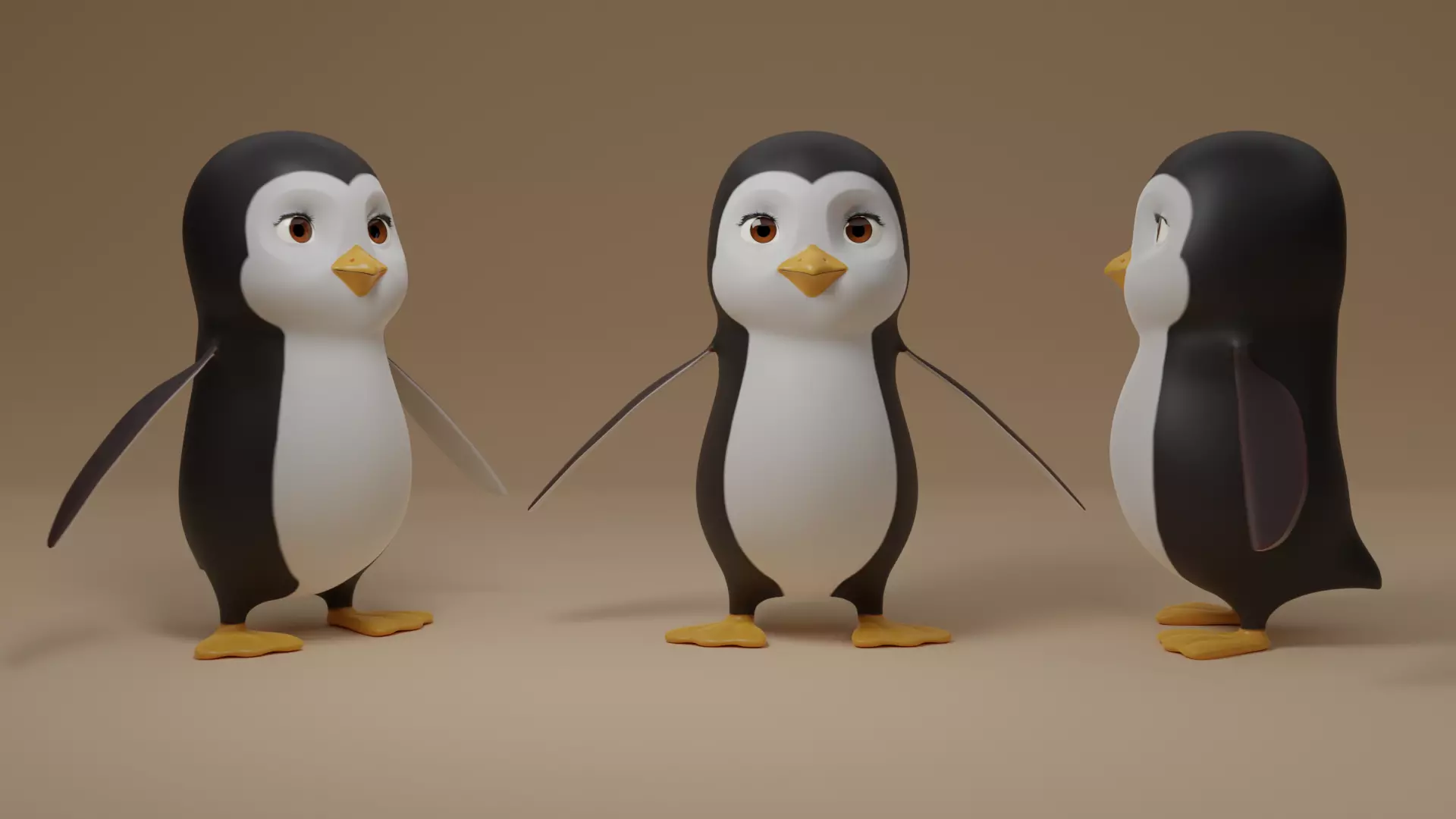 This stylized penguin 3D model is designed for animation, games, and children's content. With its rounded body, expressive face, and cute flipper-like wings, it brings a fun and playful vibe to any project. The model features large, bright eyes, a soft black-and-white color scheme, and a charming stance, making it ideal for storytelling, interactive experiences, and animated productions.