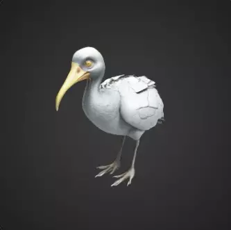 The 3D model of the Dodo bird should depict its distinctive, round, plump body, with a small head attached to a short neck. The large, hooked beak should be detailed with a smooth yet slightly cracked texture, colored in shades of yellowish-green. Its wings should be small and tucked against the body, showing the bird’s inability to fly. Cover the body with a dense layer of grey and brown feathers, gradually fading to white at the belly and tail.