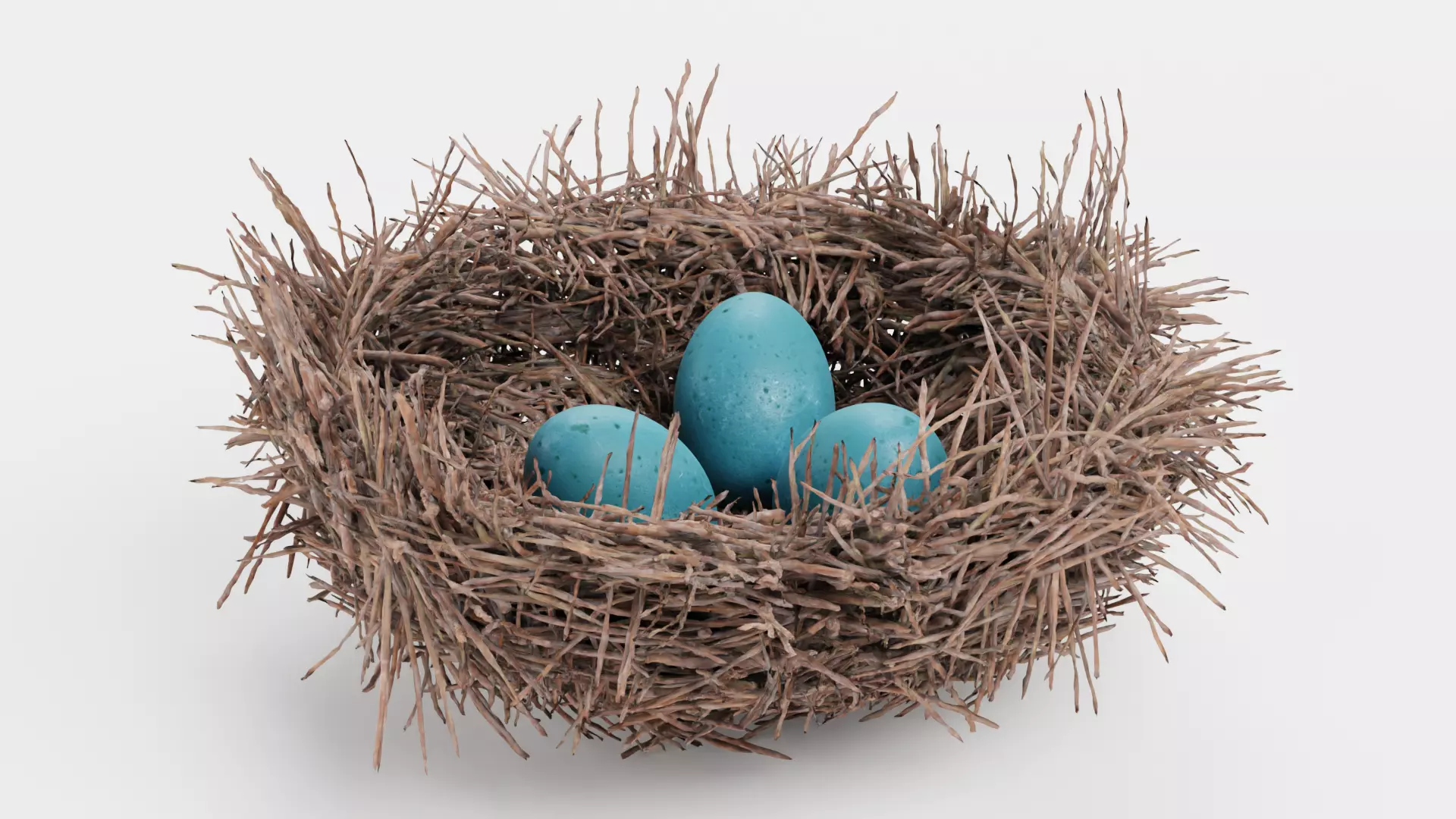 A detailed bird nest combined with three blue eggs, adding a clear focal point and natural element to the asset. The nest is built from interwoven twigs that extend outward, creating an organic and slightly irregular silhouette. The geometry captures the layered arrangement of natural materials, making the model suitable for closer views, nature scenes, environmental storytelling, or detailed prop setups.