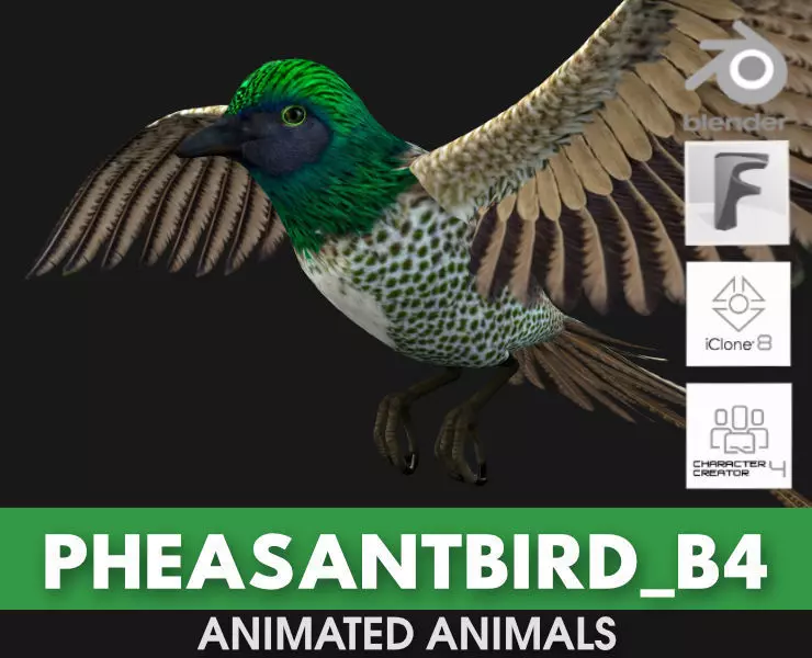 5. iAvatar- Iclone8_CC4 and rlmotion• Frame Rate: 60 Fps• Textures: PBR_Yes• DiffuseMap PNG 2048 X 2048• NormalMap PNG 2048 X 2048• OpacityMap PNG 2048 x 2048• AoMap PNG 2048 x 2048• DisplacementMap PNG 2048 x 2048• Motions: 05_Acrobatic, Fly, FlySlow, Landing, Play• Rigging: Yes• Plugins (Addon): No• Customize products as required: NoPheasantBird Model Motions B1,2,3,4 Use the same video describing Typical Motions. They only differ in Color and Material.FBX Export is specific to Blender, 3Dsmax, Maya, error may occur if using other platform to import, please contact for support.Materials are maximally simplified, usually using only 1-3 PBR materials so you can use them for most 3D Software that supports motion today.• Web: https://animated3d.org• Need technical support, please contact via Email: Animated3d.us@gmail.comI would like to express my heartfelt gratitude to all our loyal customers who have supported and cherished our 3D moving creatures. Thank you for giving me the opportunity to bring joy and excitement to your lives through our products. Without you, I wouldn't exist and thrive. I hope that we will continue to share happiness and creativity together in the future. Sincerely, thank you!