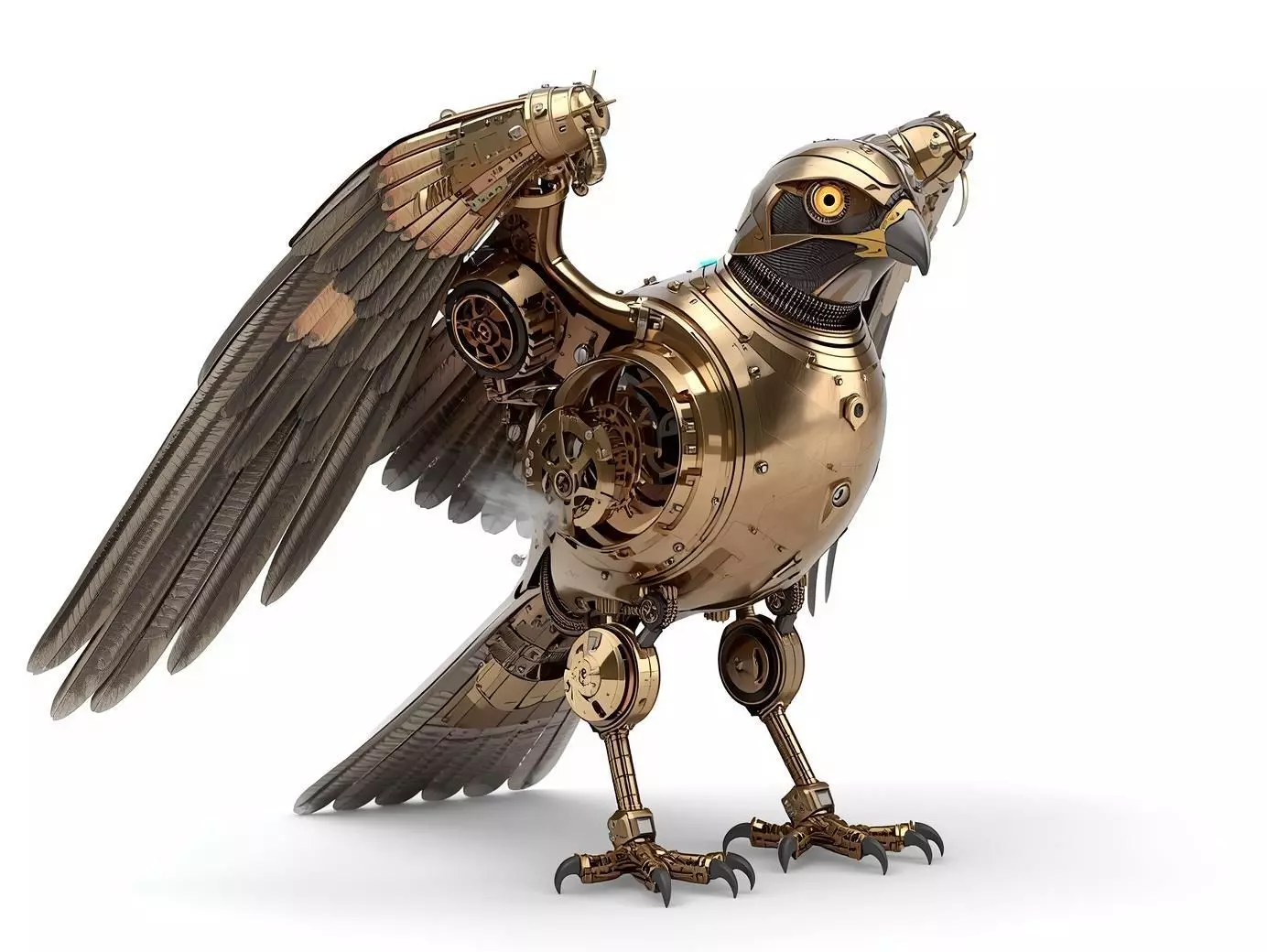 Key FeaturesDesign: Realistic Falcon form integrated with complex Steampunk mechanical armor and wings.