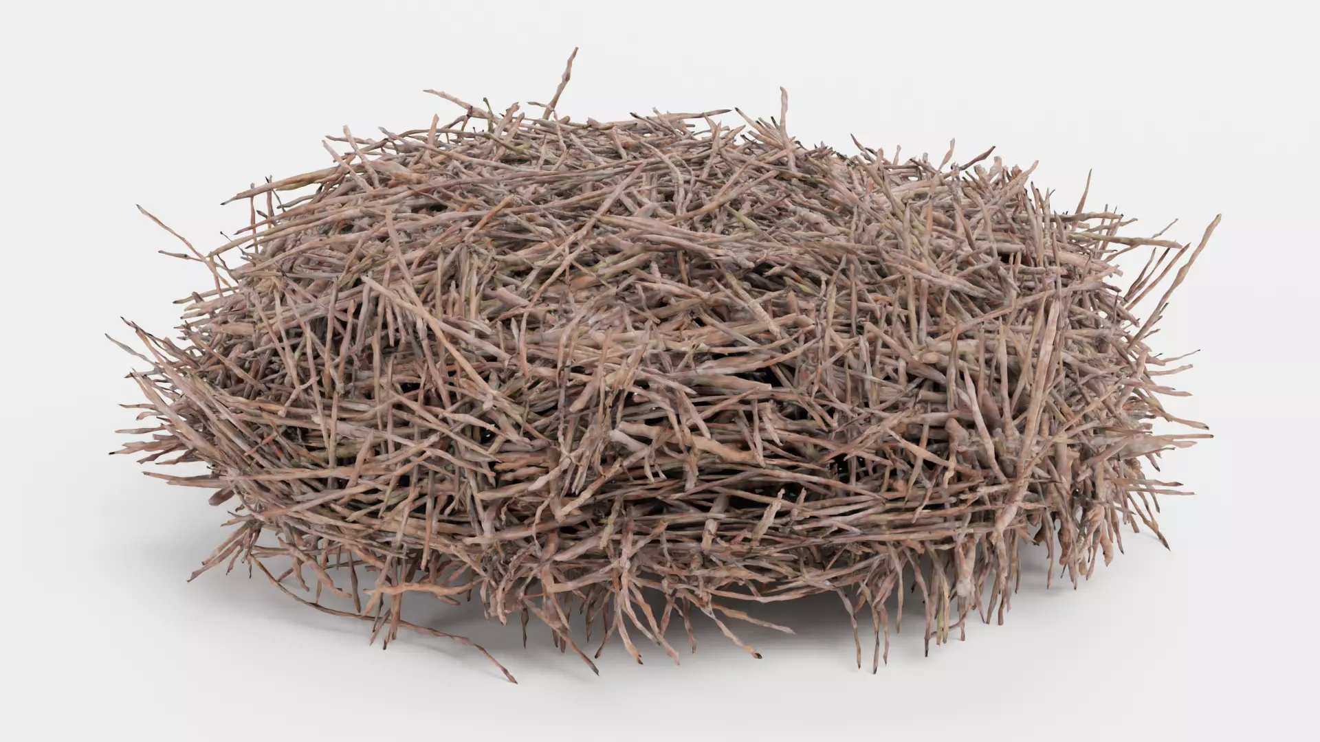 A wide, shallow bird nest inspired by stork habitats, built from loosely interwoven twigs. The structure spreads more horizontally, creating an open and slightly flattened form. Individual branches extend outward, giving the model a natural form that reads well from different angles. The layered twig arrangement is clearly defined, allowing the nest to hold detail even in closer views. Suitable for nature scenes, environmental storytelling, or larger habitat setups.