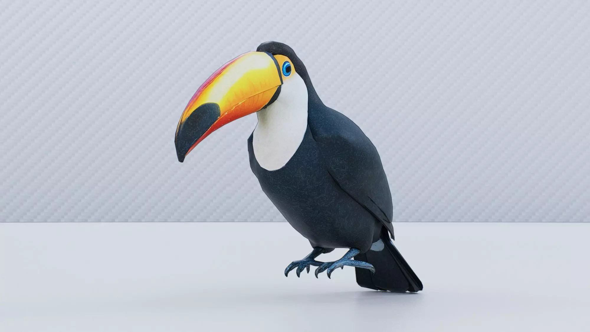 This 3D low-poly model represents a Toco Toucan (Ramphastos toco), the largest and most iconic species of toucan. Known for its strikingly large, colorful beak, this digital rendering captures the bird’s distinctive silhouette with stylized yet accurate proportions. The model features a glossy black body, bright white throat patch, vivid blue eyes, and a vibrant beak with gradients of yellow, orange, and red—hallmarks of its tropical appearance. Designed with optimized geometry for efficient performance in real-time applications such as games or VR environments, the model retains key visual characteristics while maintaining a clean, simplified mesh ideal for animation and interactive use.
