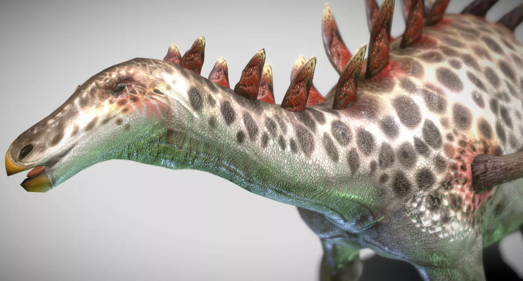 Kentrosaurus was a genus of stegosaurid dinosaur that lived during the Late Jurassic period, approximately 155 to 150 million years ago. It was a relatively small member of the stegosaur family, measuring around 4.5 meters (15 feet) in length and weighing up to 1.5 metric tons. Kentrosaurus is known for its distinctive double row of bony plates and spikes that ran along its back and tail. The plates were smaller and more pointed compared to its more famous relative, Stegosaurus. Towards the tail, these plates transitioned into long, sharp spikes, which likely served as a formidable defense against predators. Kentrosaurus had a small head with a beak-like mouth, suited for a herbivorous diet consisting of low-lying plants. Its fossils have been primarily found in what is now Tanzania, Africa. The discovery of Kentrosaurus has provided valuable insights into the diversity and evolution of stegosaurs, as well as their ecological role during the Late Jurassic period.