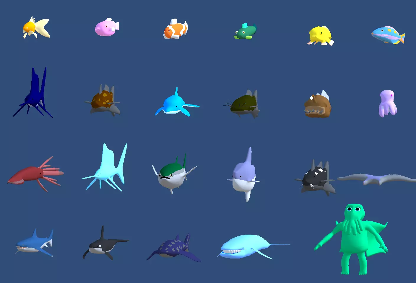 Fishes made for mobile low poly fishing gamessingle texture used by every fish, fish from all sizesmessage me if you have any problemsfbx format, png texture and iconsSalmonAngler FishBlue WhaleCatfishClownFishCoelacanthSquidCtulhuDolphinFrog FishGold FishGreat White SharkKalugaManta RayMolaOctopusOrcaParrot FishPuffer FishSail FishSea StarTunaWhale Shark