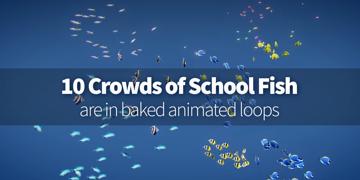 Crowds of fish are in baked animated loops.The pack contain 10 flocks of school fish: